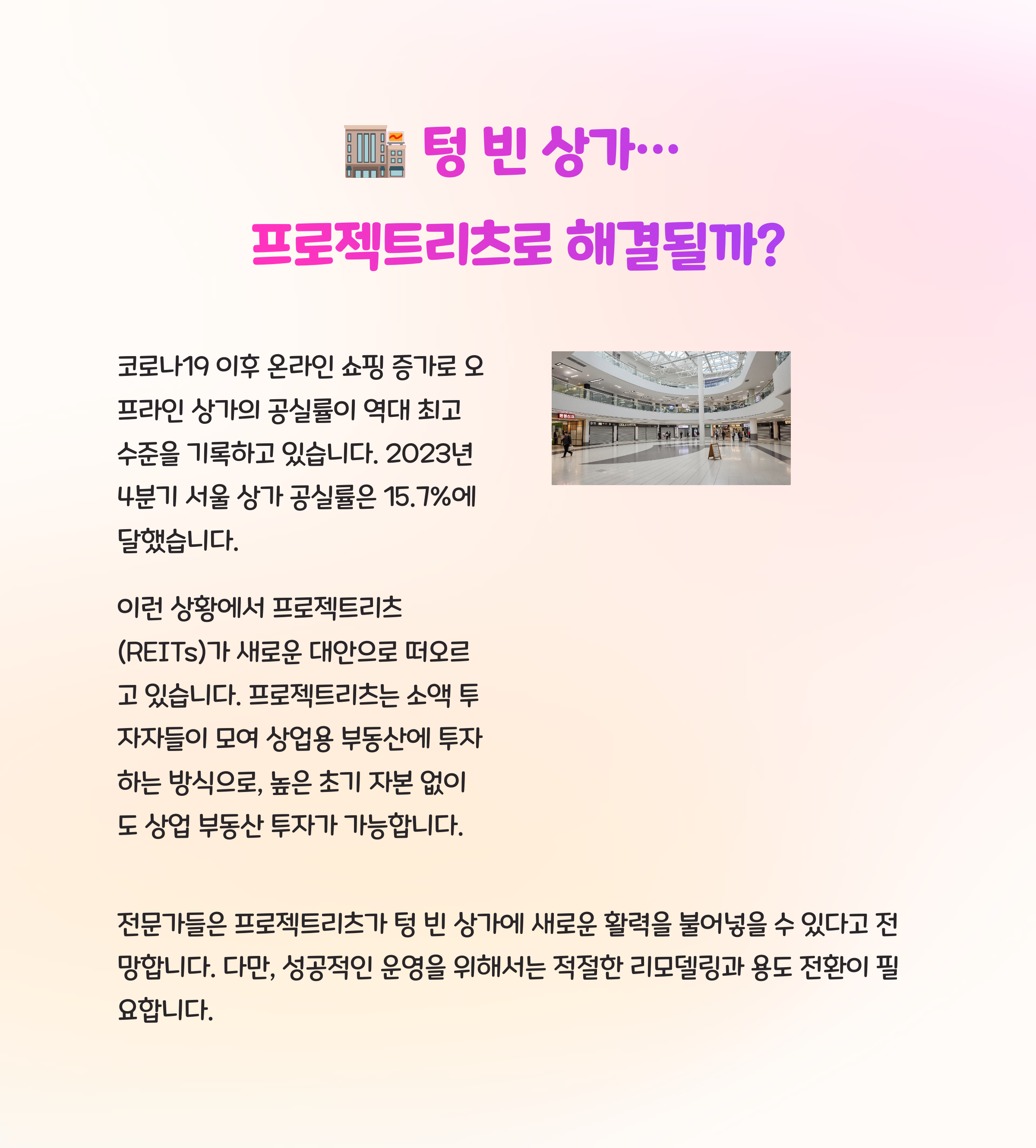 전국 주요 상권에서 공실 상가가 늘어나고 있는 가운데, 이를 해결할 방법으로 ‘프로젝트리츠’가 거론되고 있습니다.