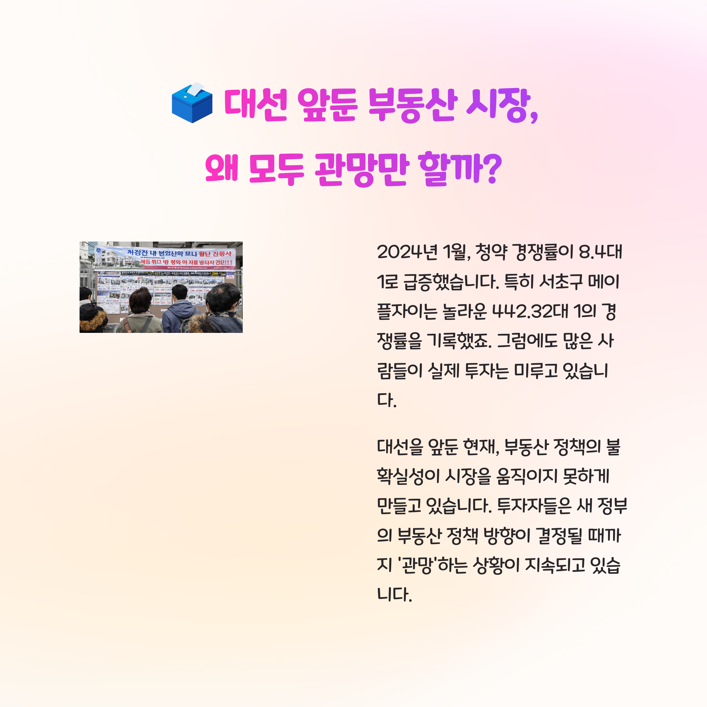 전문가들은 대선 이후 규제 완화, 세제 개편, 대출 정책 등이 바뀔 가능성이 있는 만큼, 6월까지는 투자 타이밍을 신중히 잡는 것이 바람직하다고 조언합니다.