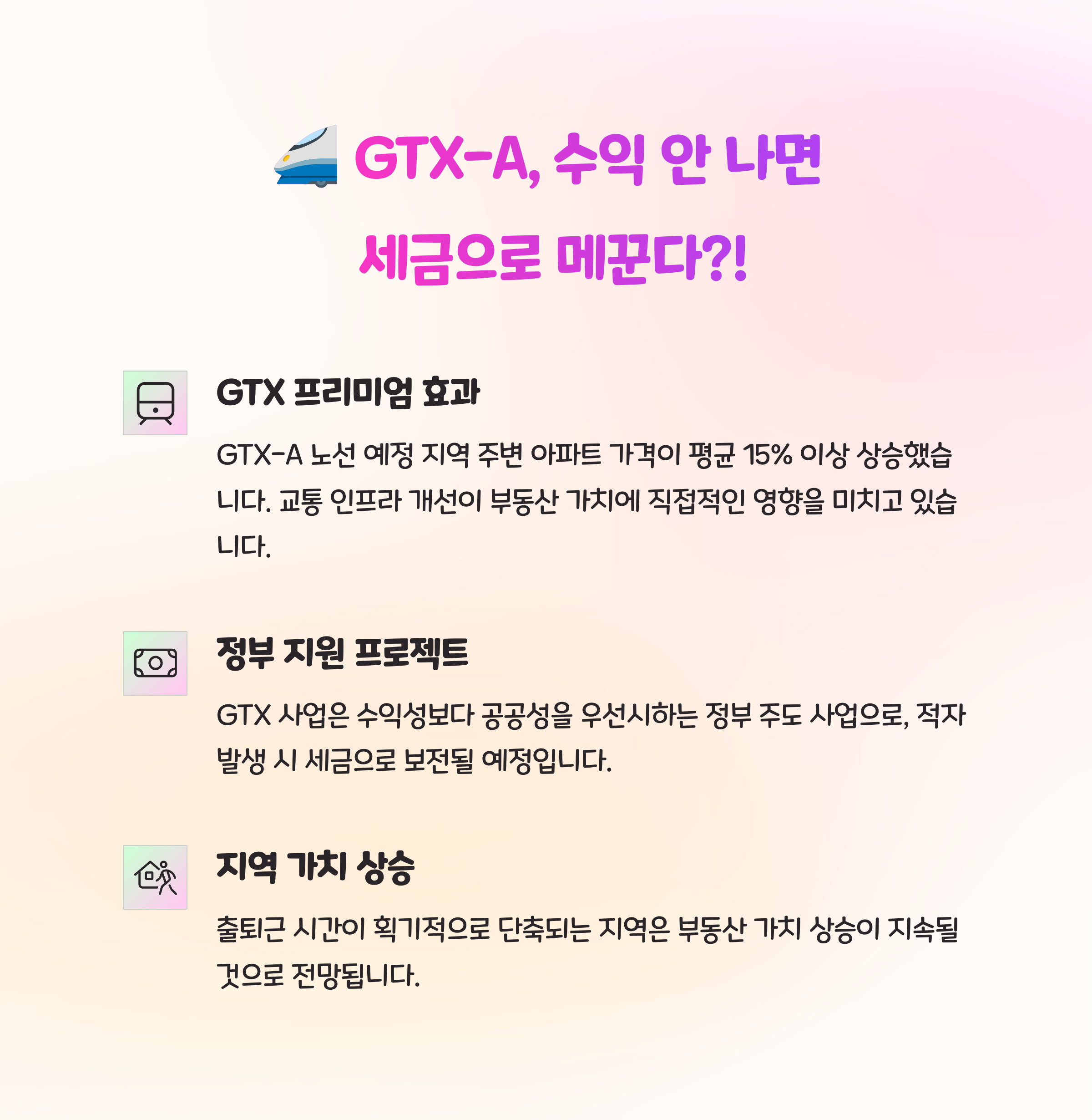 GTX-A 등 일부 노선은 수익성 논란과 정책 신뢰 이슈가 겹쳐 단기 급등은 어렵고, 중장기 관점에서 접근이 필요합니다.