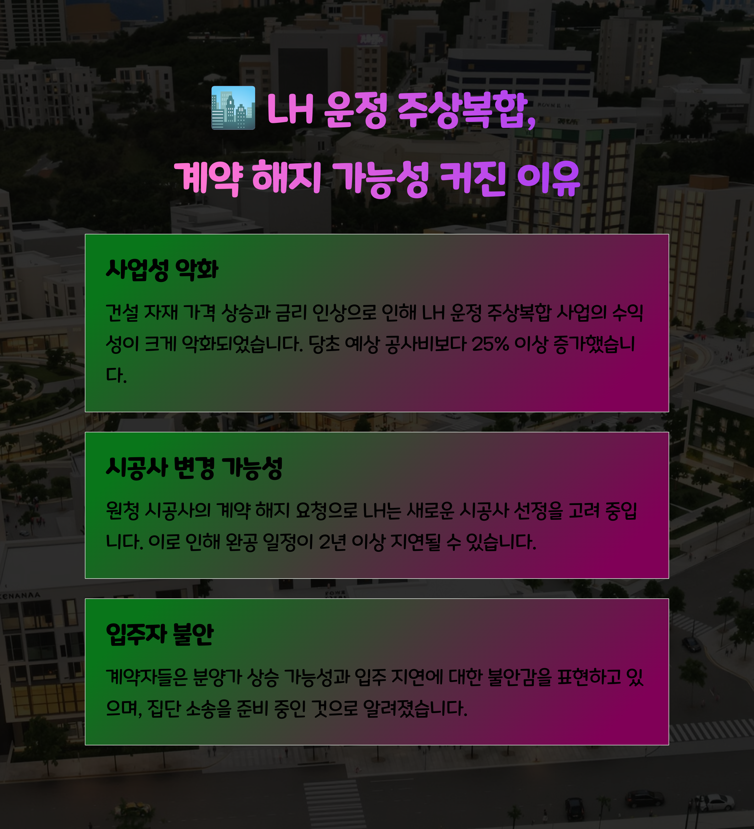 LH가 파주 운정신도시에서 추진 중인 주상복합 개발 사업이 시행사의 대금 미납 문제로 인해 해지 검토 단계에 들어섰습니다.