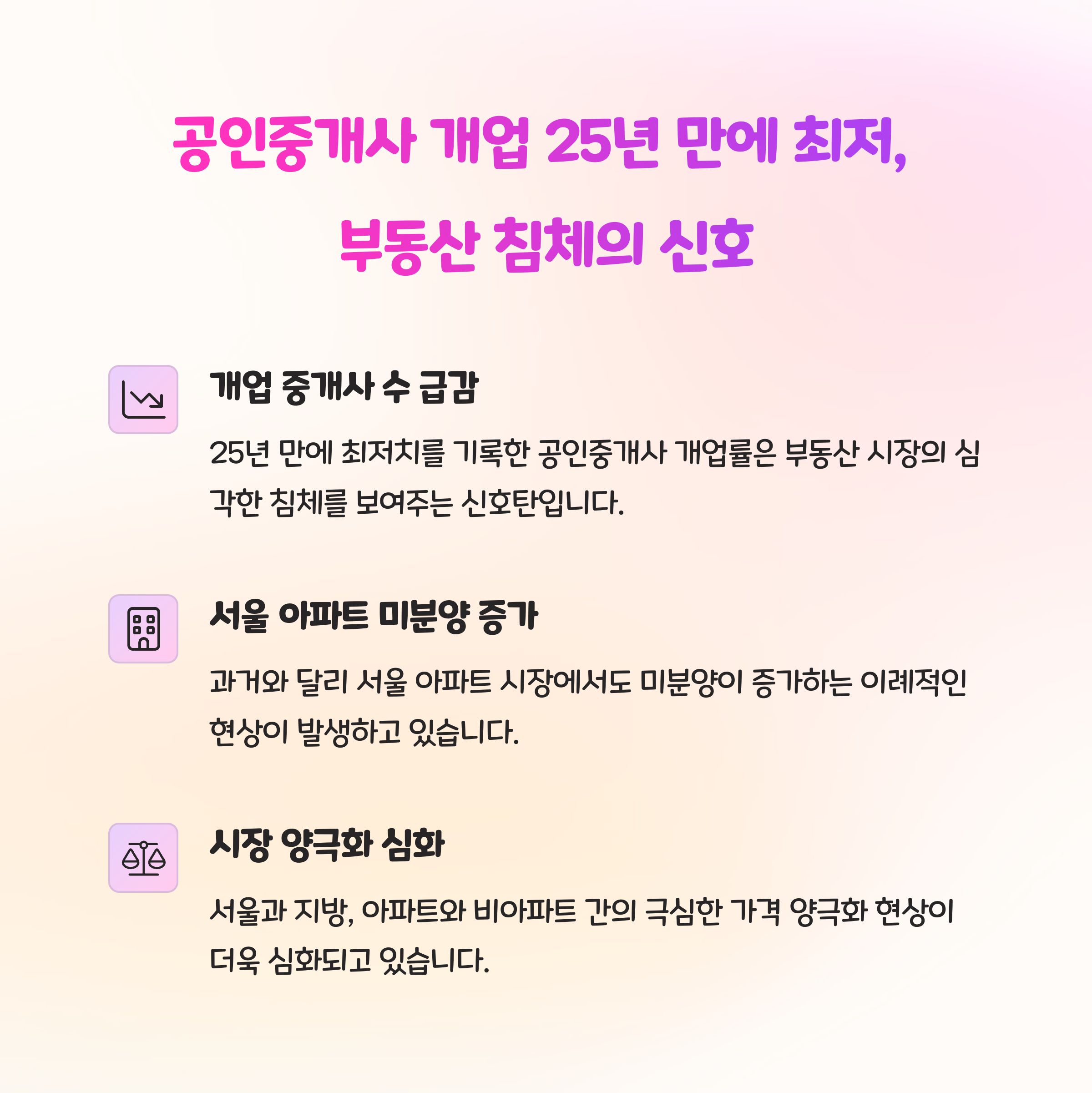 기존 중개업소도 수익 악화로 어려움을 겪고 있어, 앞으로 공인중개사 시장의 구조 변화가 본격화될 가능성이 높아지고 있어요.