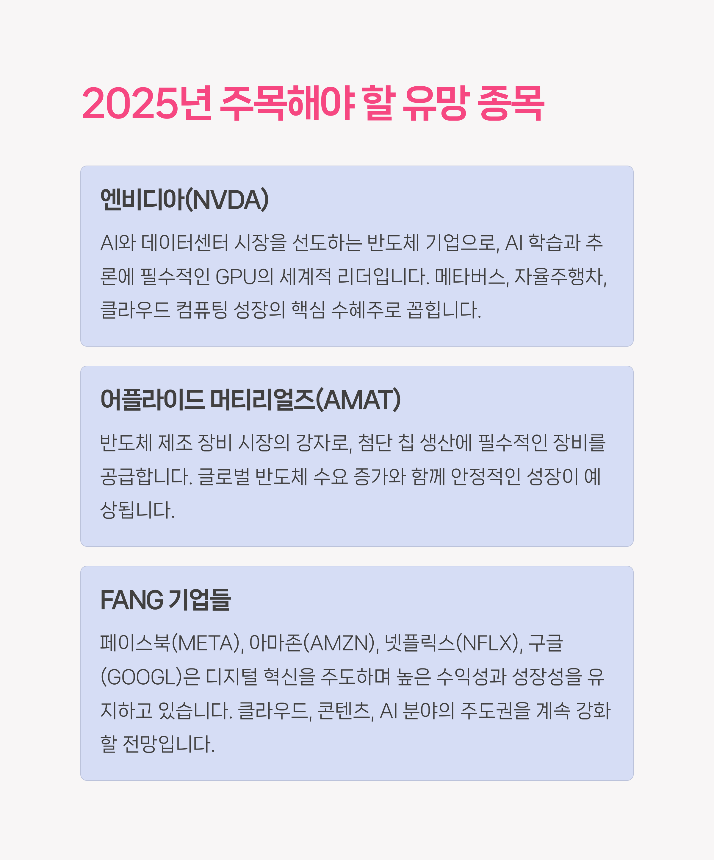 💹 추천 종목 중에서도 엔비디아(NVDA)는 AI 분야에서 독보적인 기술력을 바탕으로 높은 수익률을 기대하게 합니다.