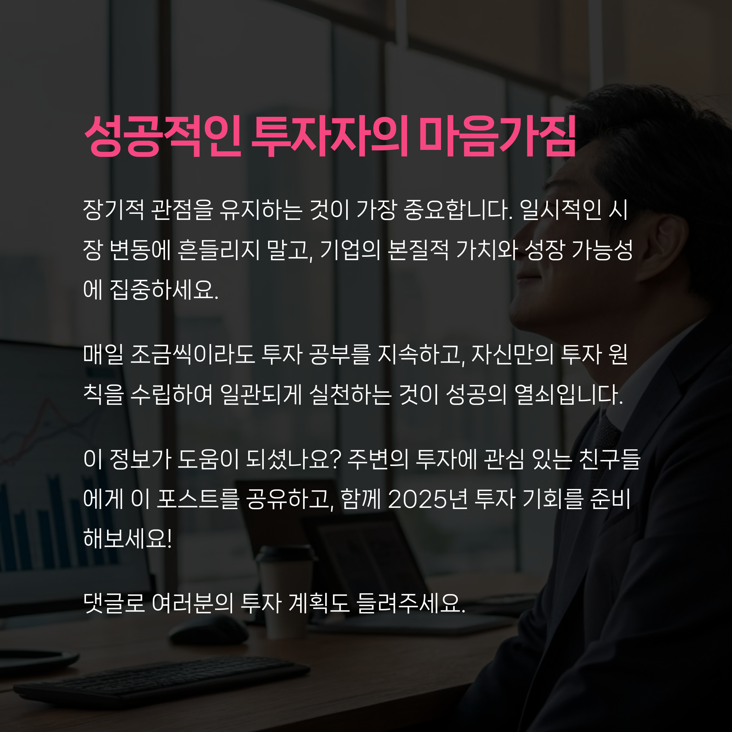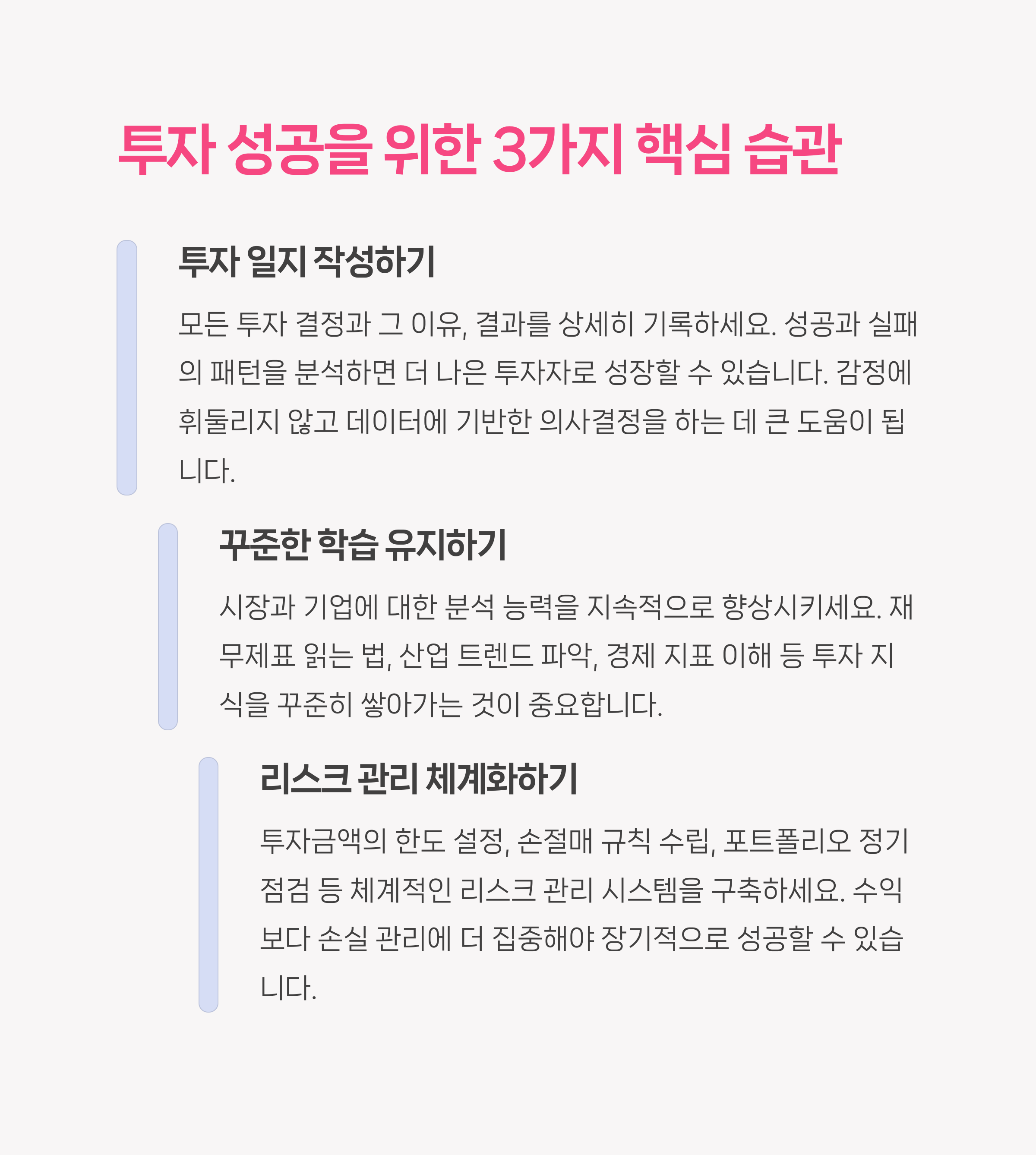 막연한 불안함보다는 기본 원칙을 바탕으로 한 안정적인 접근법을 통해, 주식 투자에 대한 이해를 높이고 실질적인 수익으로 연결될 수 있도록 돕겠습니다.