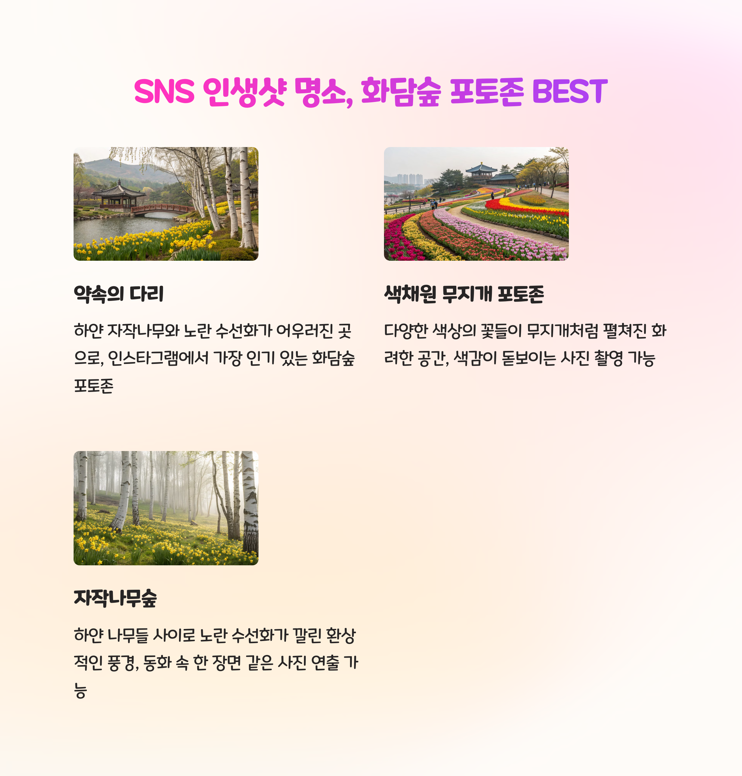 | 힐링 산책로 | 약 1시간 | 수선화존, 연못, 숲속 포토존 많음 |