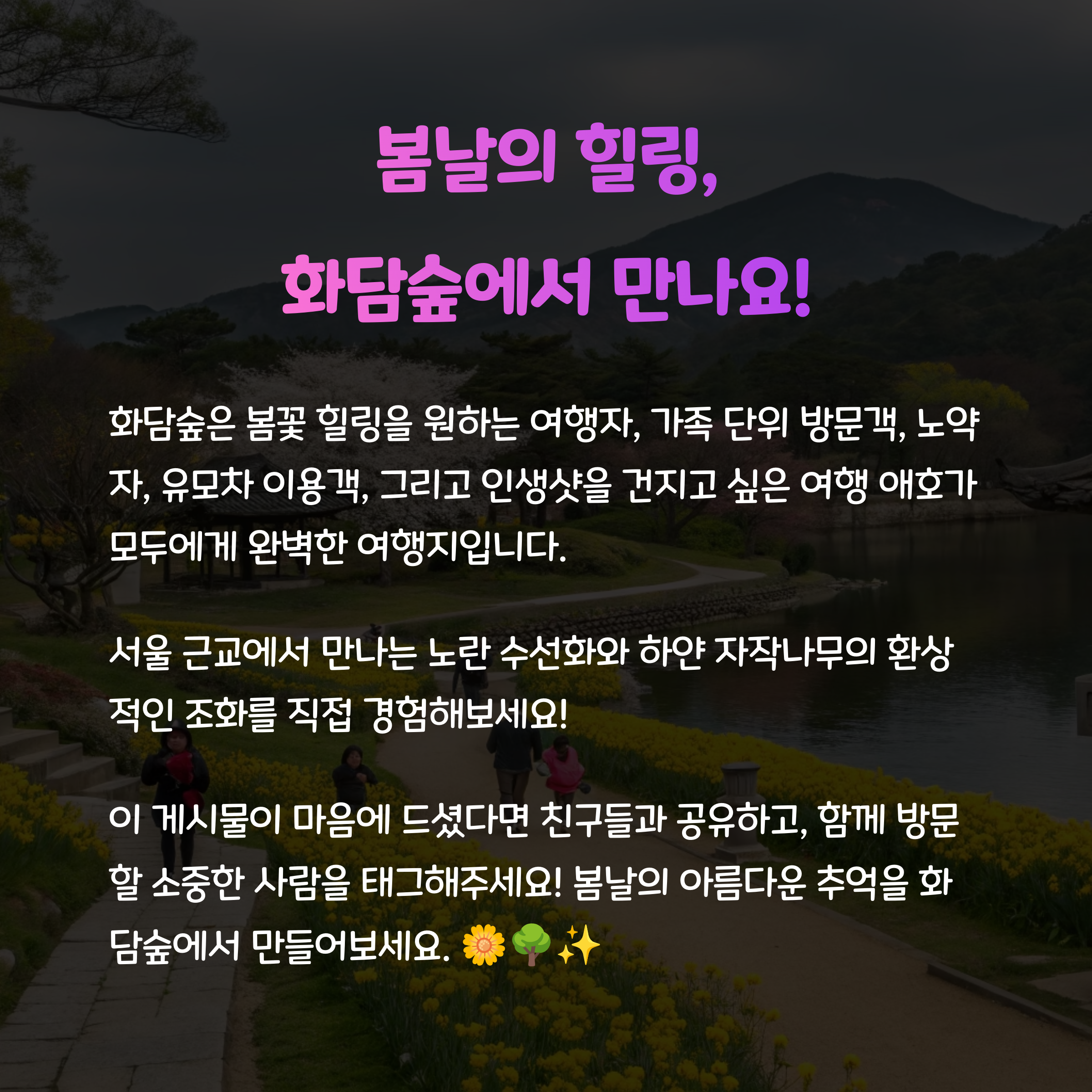 수선화, 튤립, 진달래 등 다양한 꽃과 숲을 함께 즐길 수 있어요.
