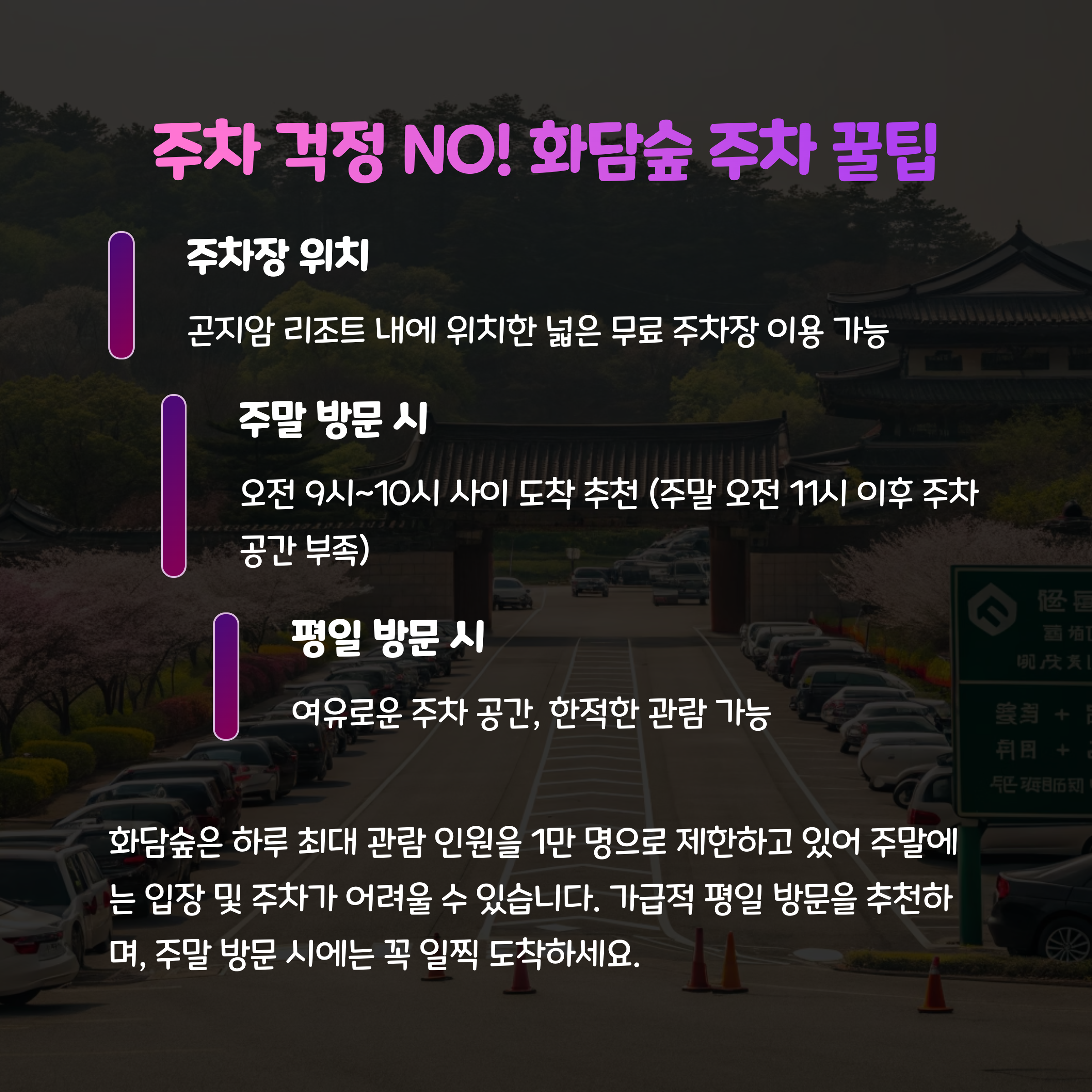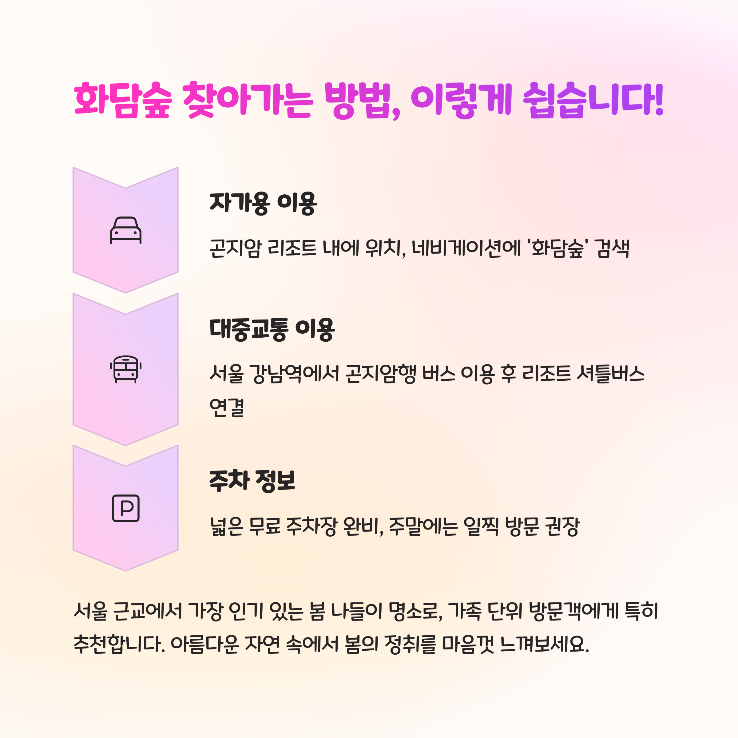 🔍 A. 화담숲 전용 주차장이 없고, 곤지암리조트 주차장(무료)을 이용하면 가장 편리합니다.