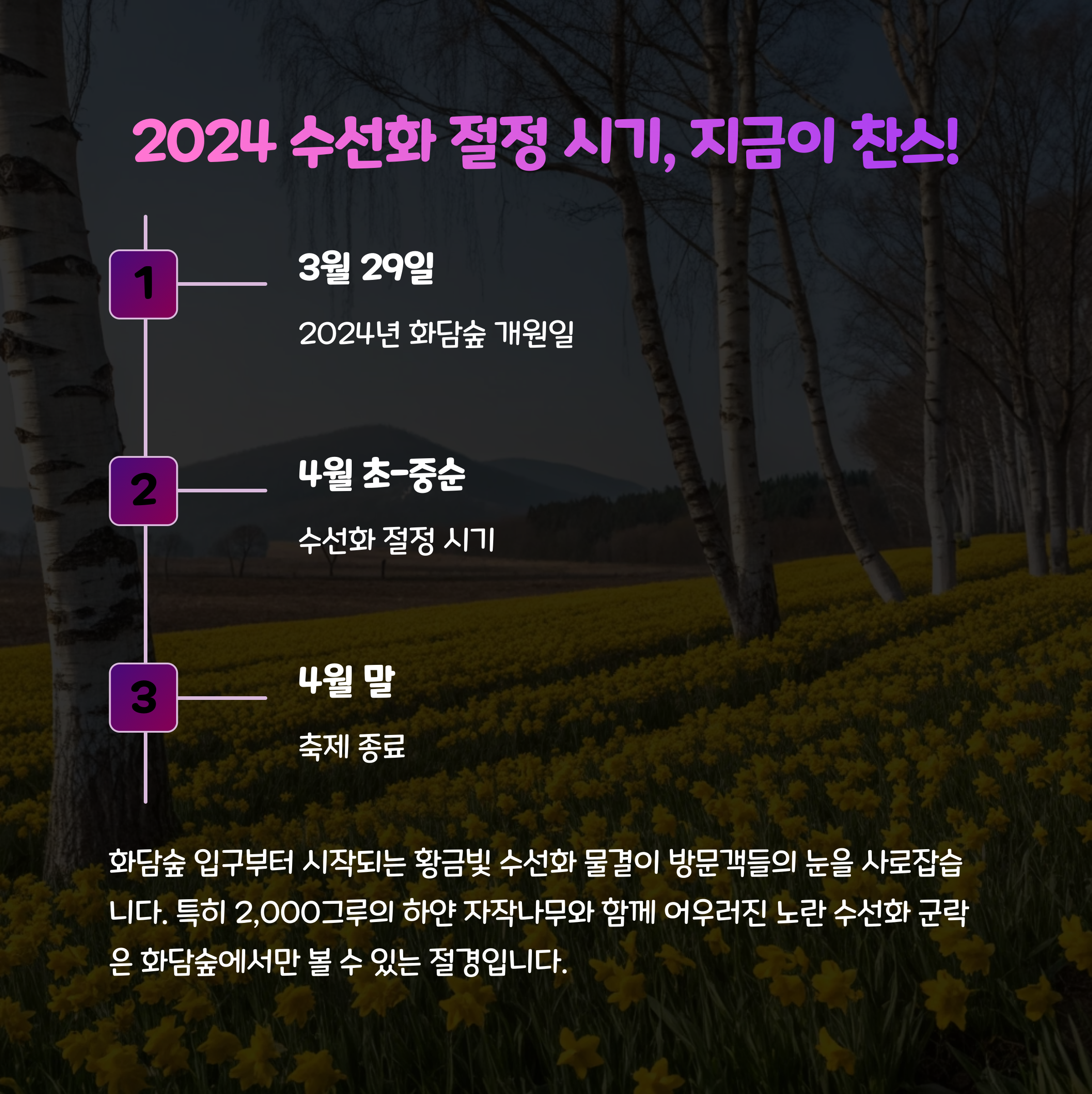 - 화담숲 수선화 시즌: 4월 초 ~ 5월 초