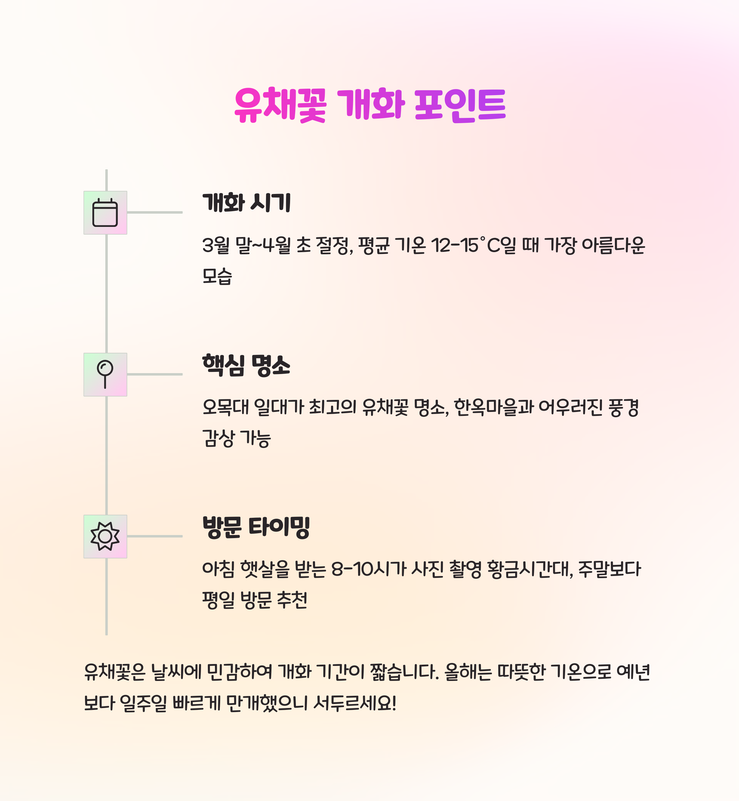 1. 유채꽃이 만개하는 전주 한옥마을, 왜 특별할까?2. 유채꽃 배경 인생샷 포인트 BEST 3
