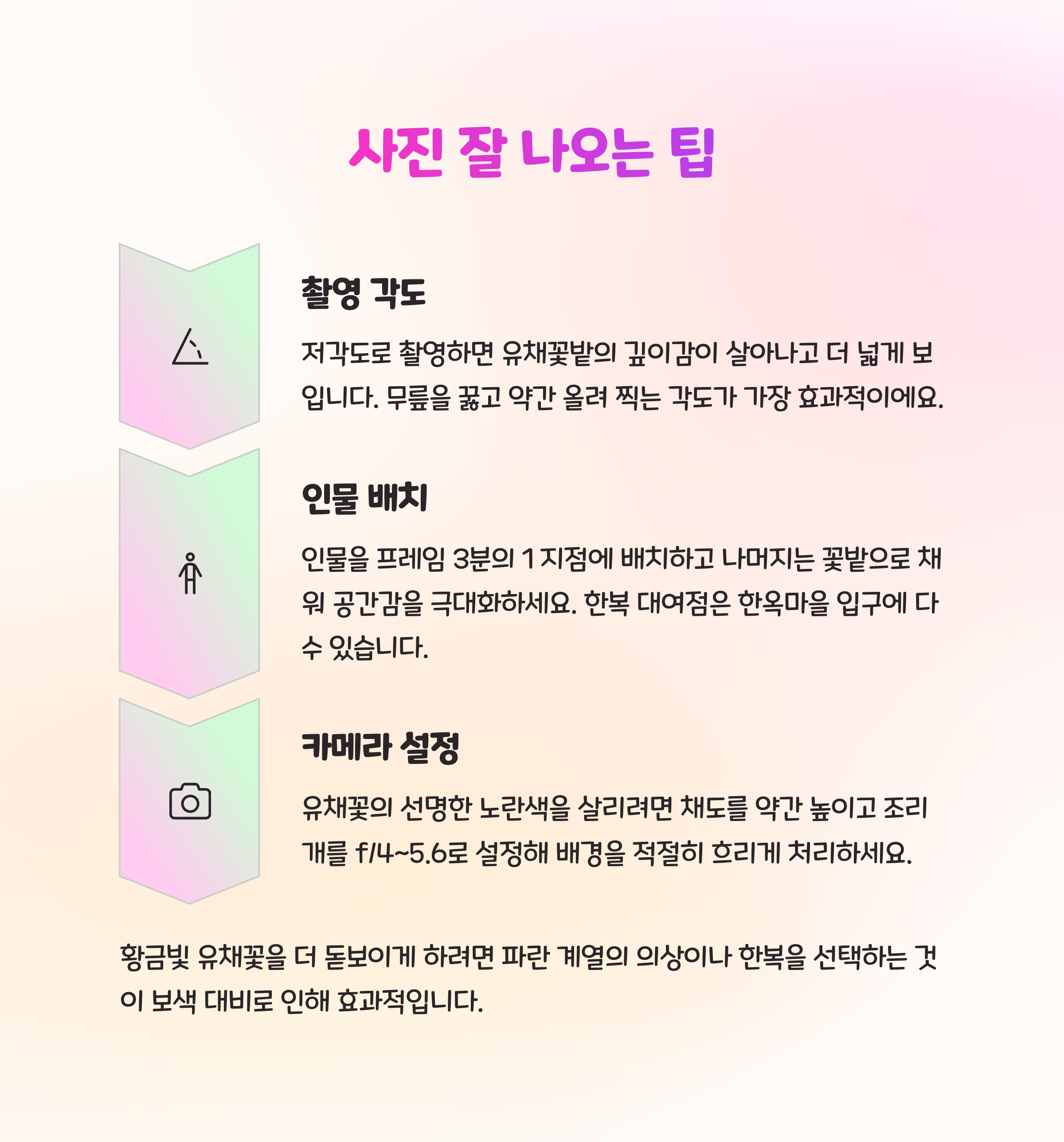 사진 잘 나오는 포인트는 정해져 있습니다! 전주 한옥마을 안에서도 유채꽃이 밀집된 구역은 따로 있고, 빛, 사람 적은 시간, 배경 구성도 중요한 요소예요.👍