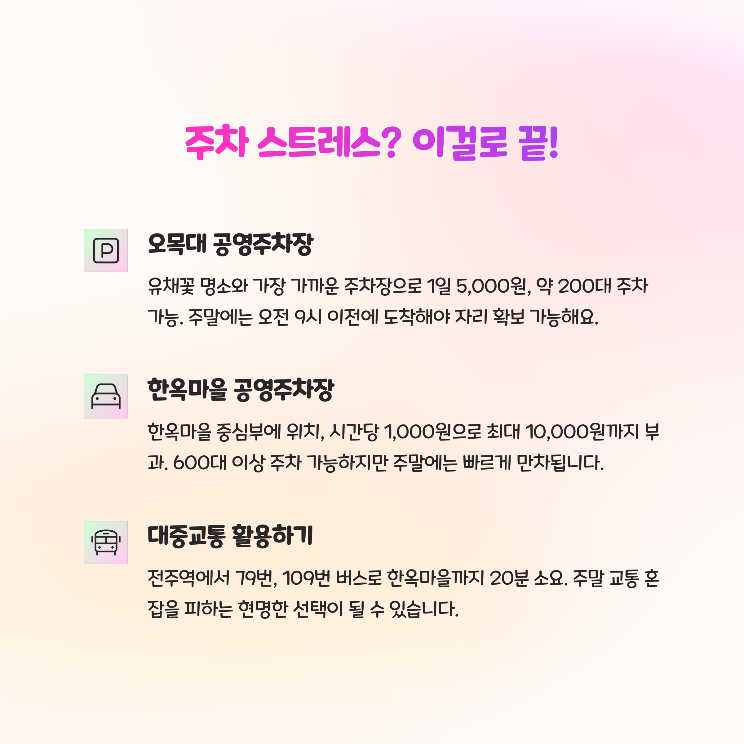 | 한옥마을 공영주차장 | 전주역 기준 차량 15분 거리 | 10분당 300원 / 1일권 가능 |