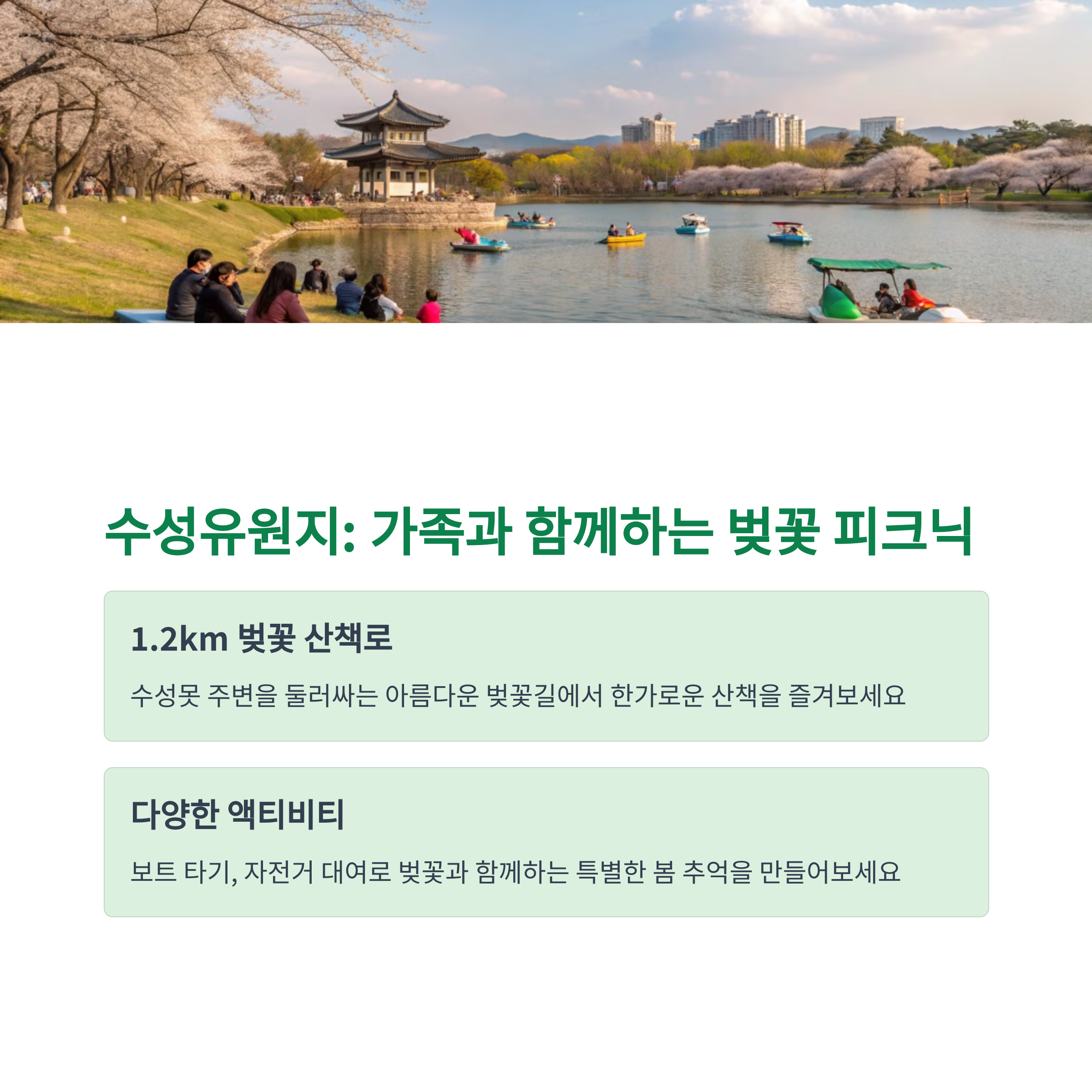반면, 가족 단위로 벚꽃을 즐기고 싶다면 수성유원지와 동촌유원지가 추천됩니다. 넓은 잔디밭과 벚꽃이 어우러져 봄 소풍을 즐기기에 최적의 장소입니다.