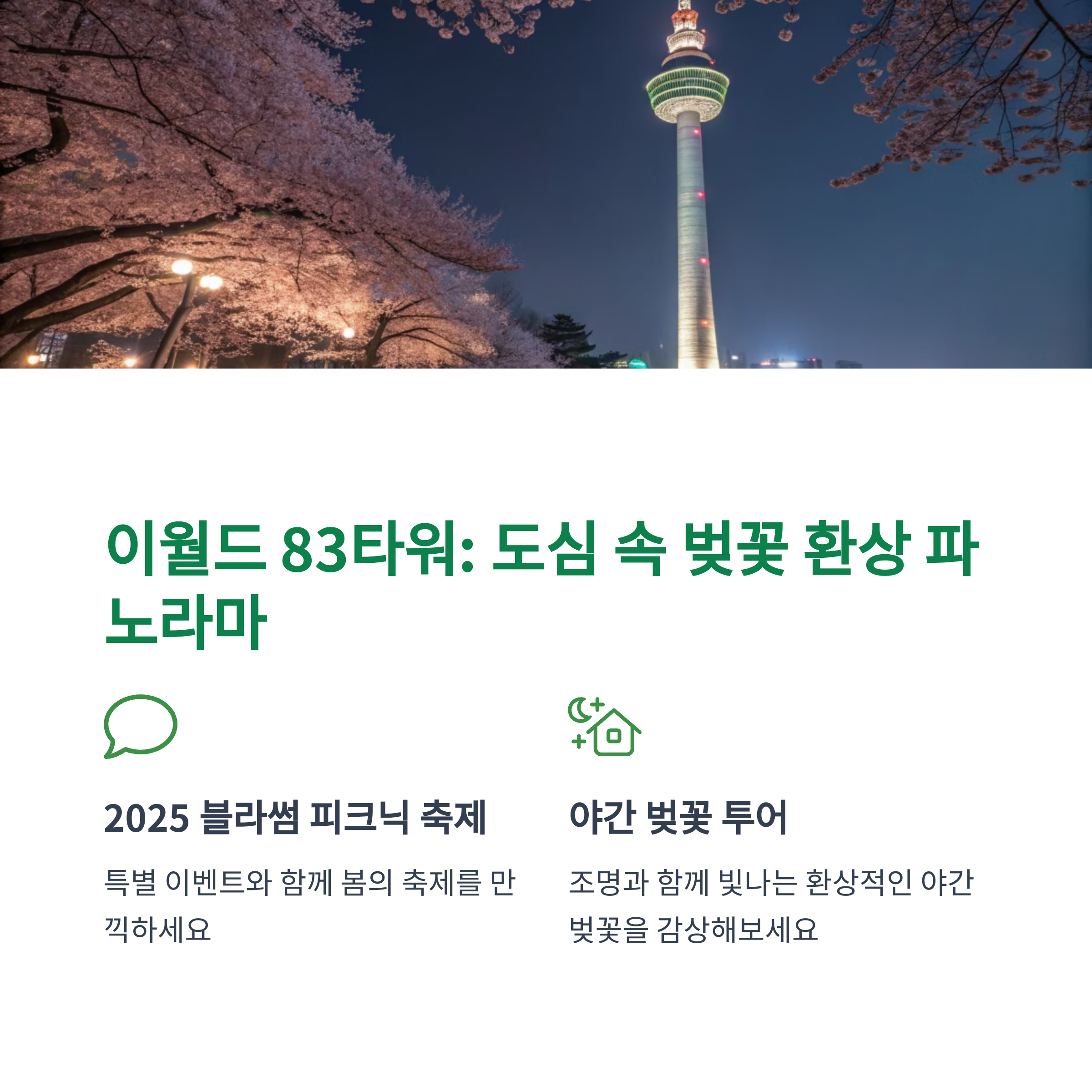 대구의 또 다른 인기 벚꽃 명소는 이월드 83 타워입니다. 도심 속에서 벚꽃을 감상할 수 있는 이곳은 특히 야간 조명이 켜지면 더욱 환상적인 분위기를 자아냅니다.