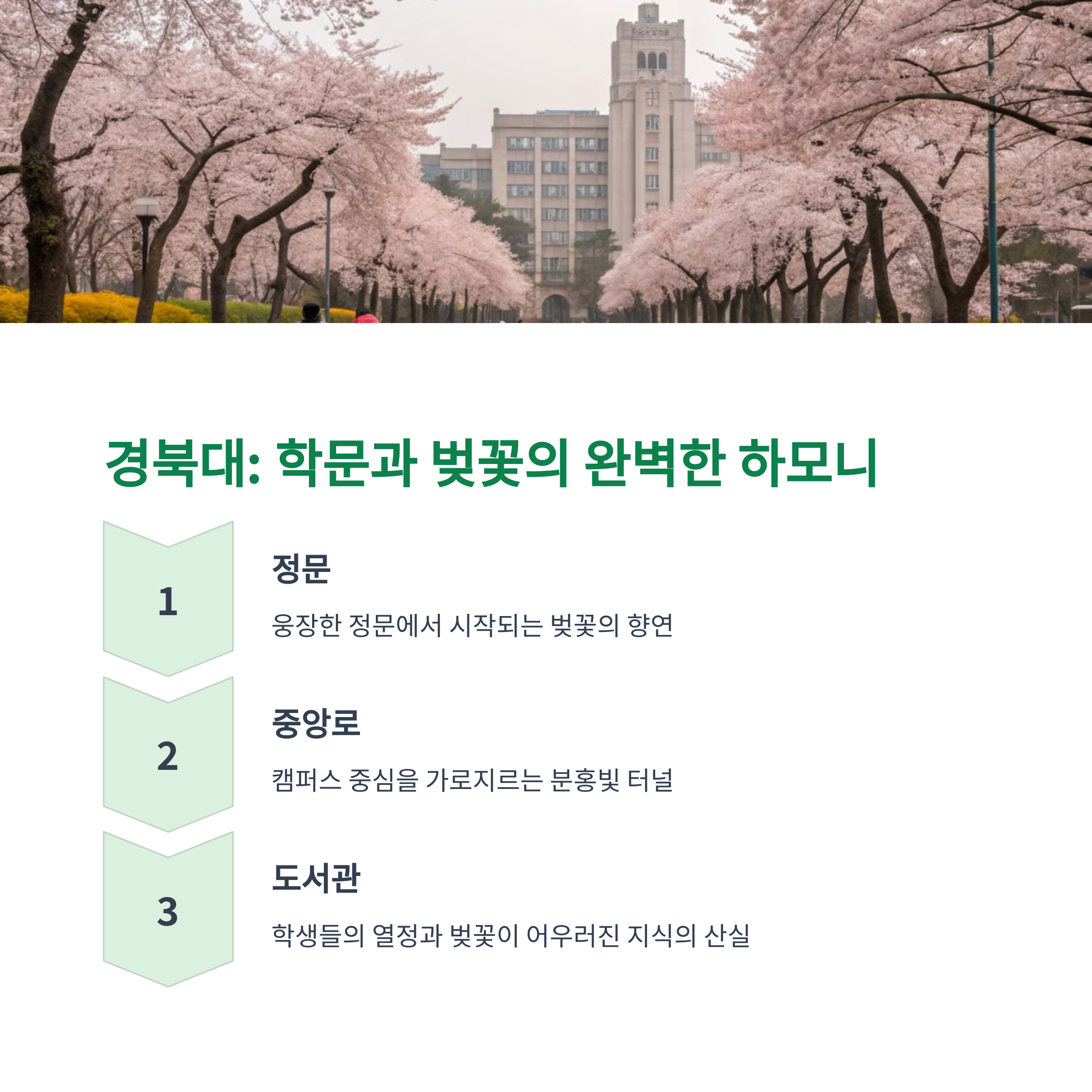 특히, 경북대의 ‘일청담’ 주변은 벚꽃과 연못이 조화를 이루며 포토존으로도 유명합니다.