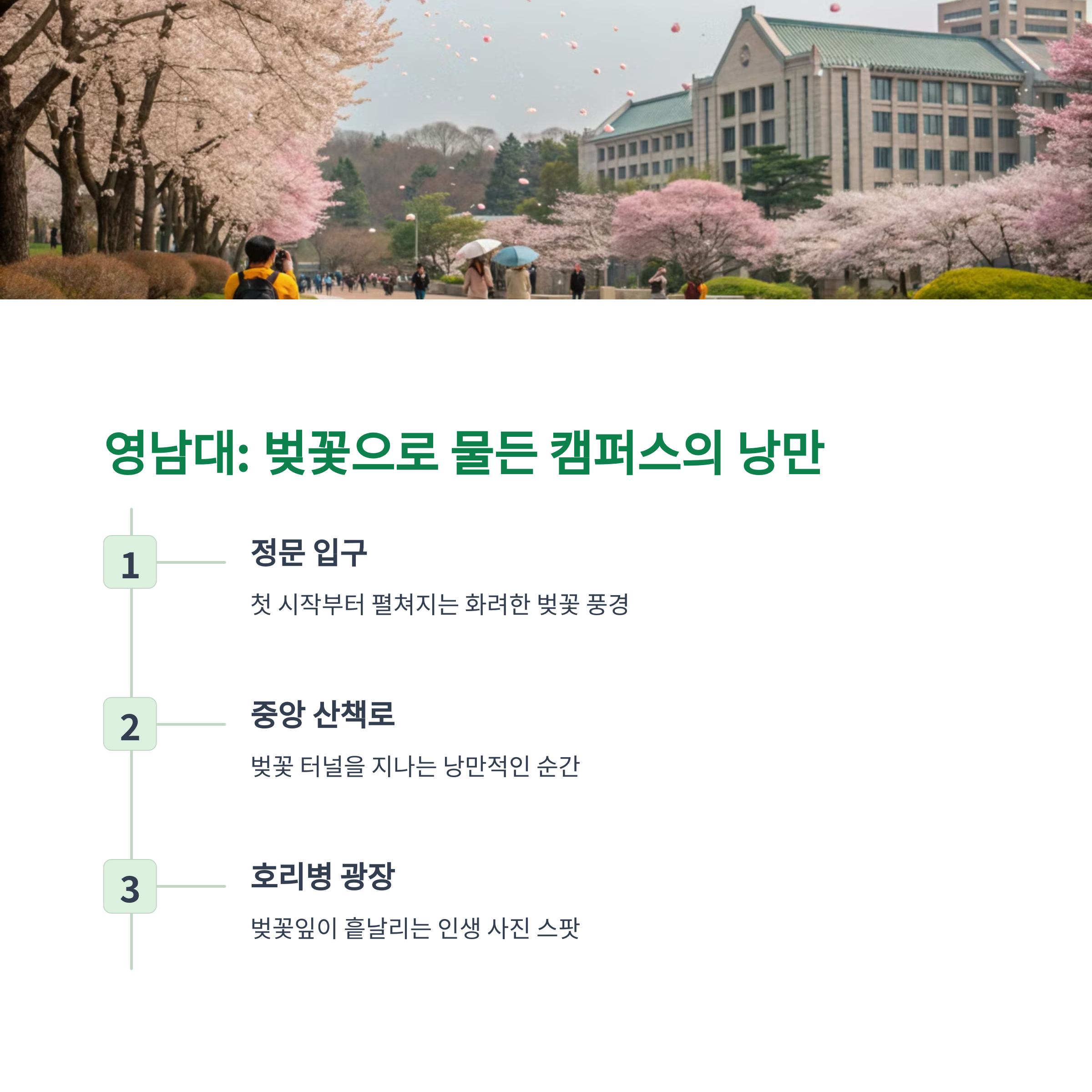 캠퍼스 벚꽃을 즐기고 싶다면 경북대학교와 영남대학교가 최고의 선택이 될 것입니다. 이 두 대학은 봄이 되면 벚꽃으로 가득 차며, 캠퍼스의 낭만적인 분위기를 만끽할 수 있습니다.
