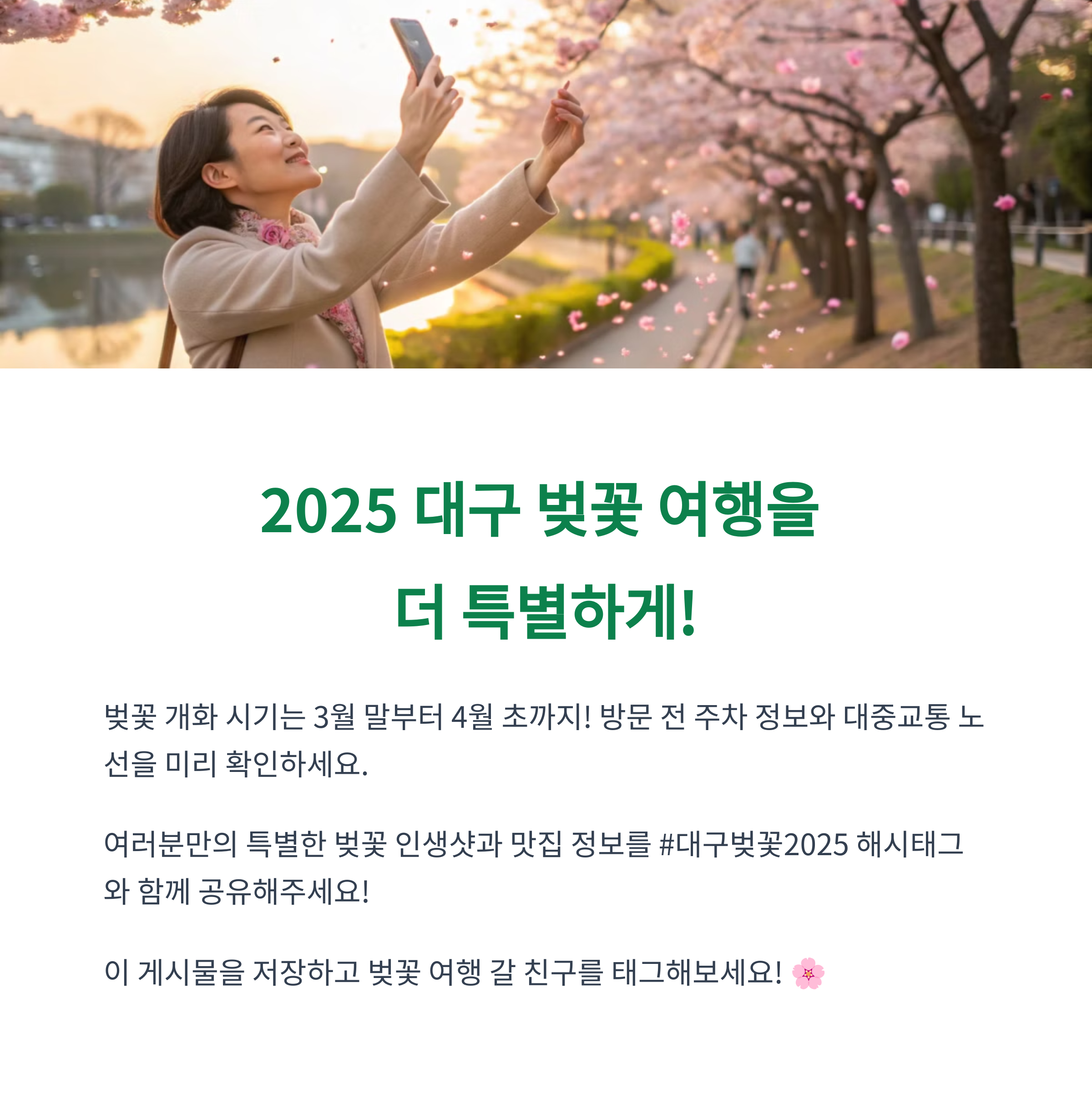 여러분이 가장 좋아하는 벚꽃 명소는 어디인가요? 대구에서 숨겨진 벚꽃 명소를 알고 계신다면 댓글로 공유해 주세요!