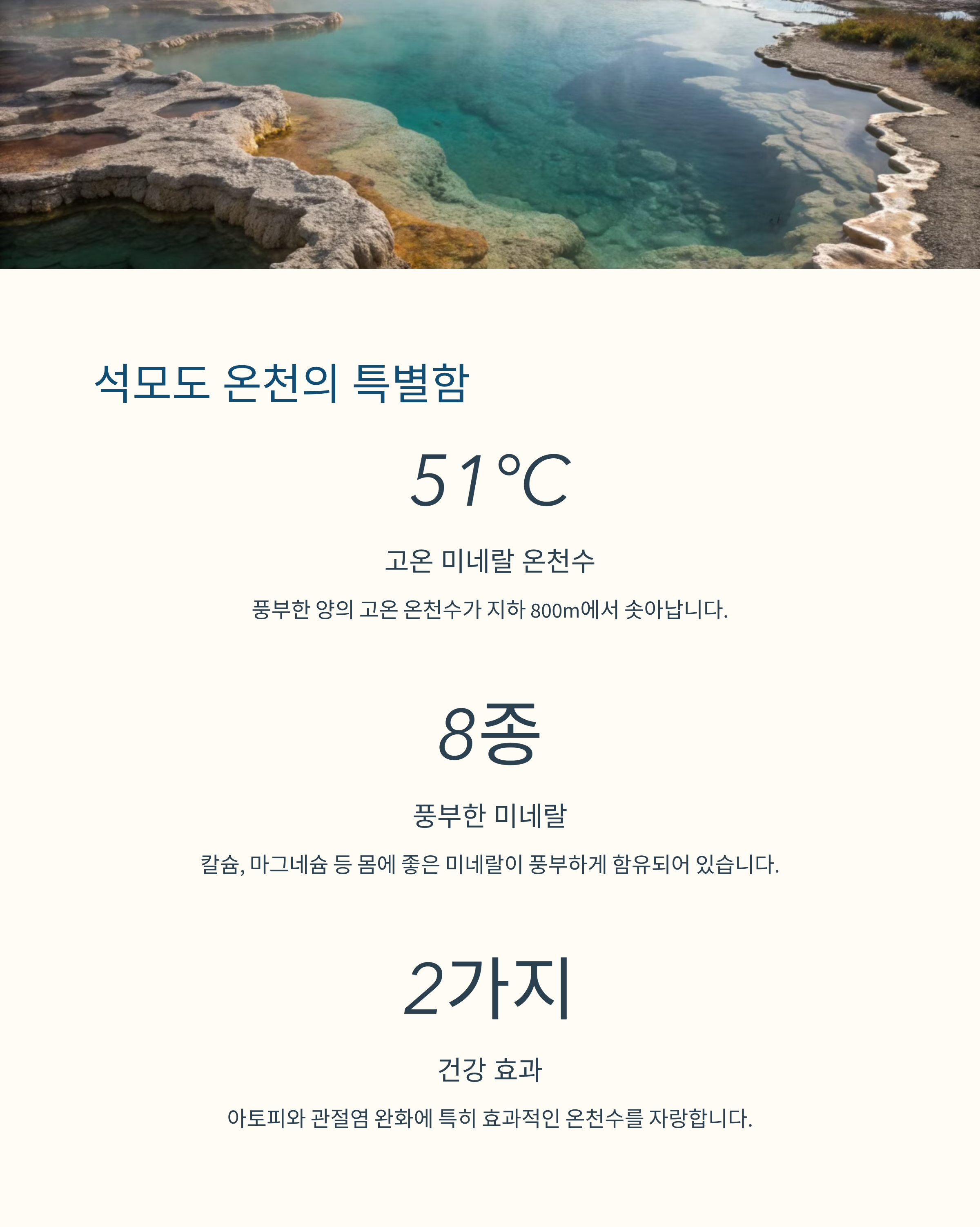 칼슘, 칼륨 등의 미네랄이 풍부해 건강에도 매우 좋으며, 온천욕 후에는 피부가 매끈해지는 느낌을 받을 수 있습니다.
