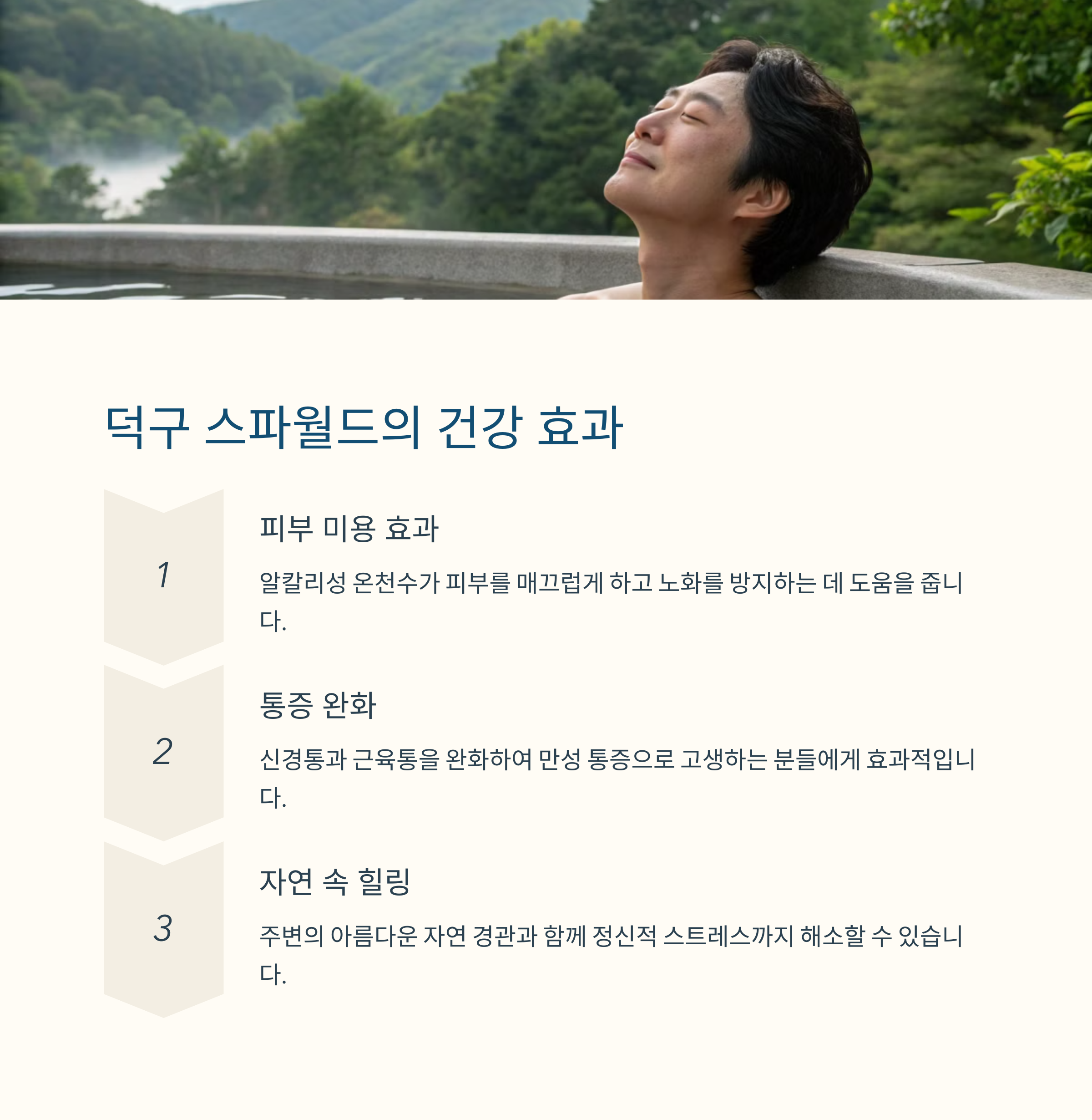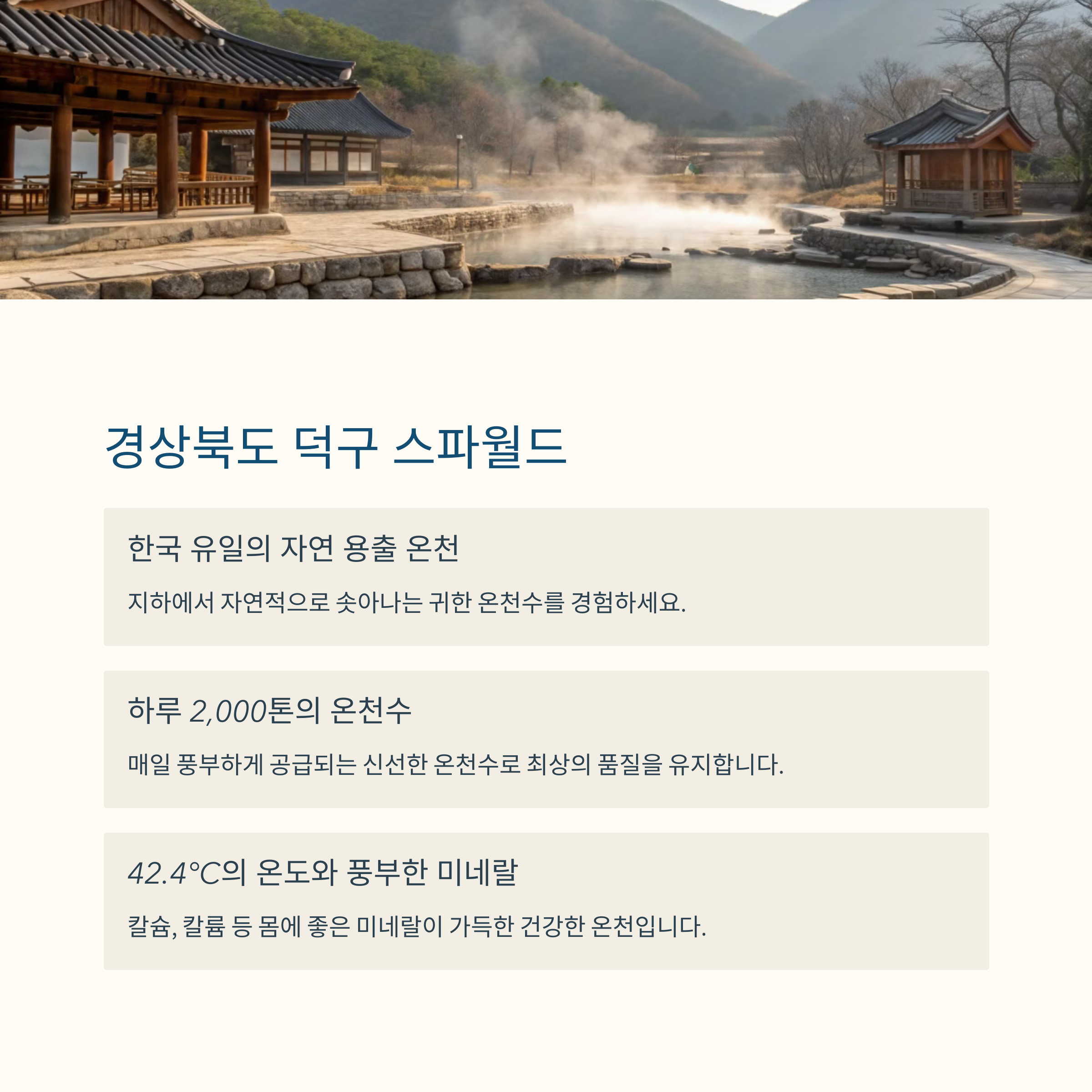 덕구 스파월드는 한국에서 유일하게 자연 용출되는 온천으로, 42.4°C의 따뜻한 온천수가 매일 2,000톤씩 흐르고 있습니다.