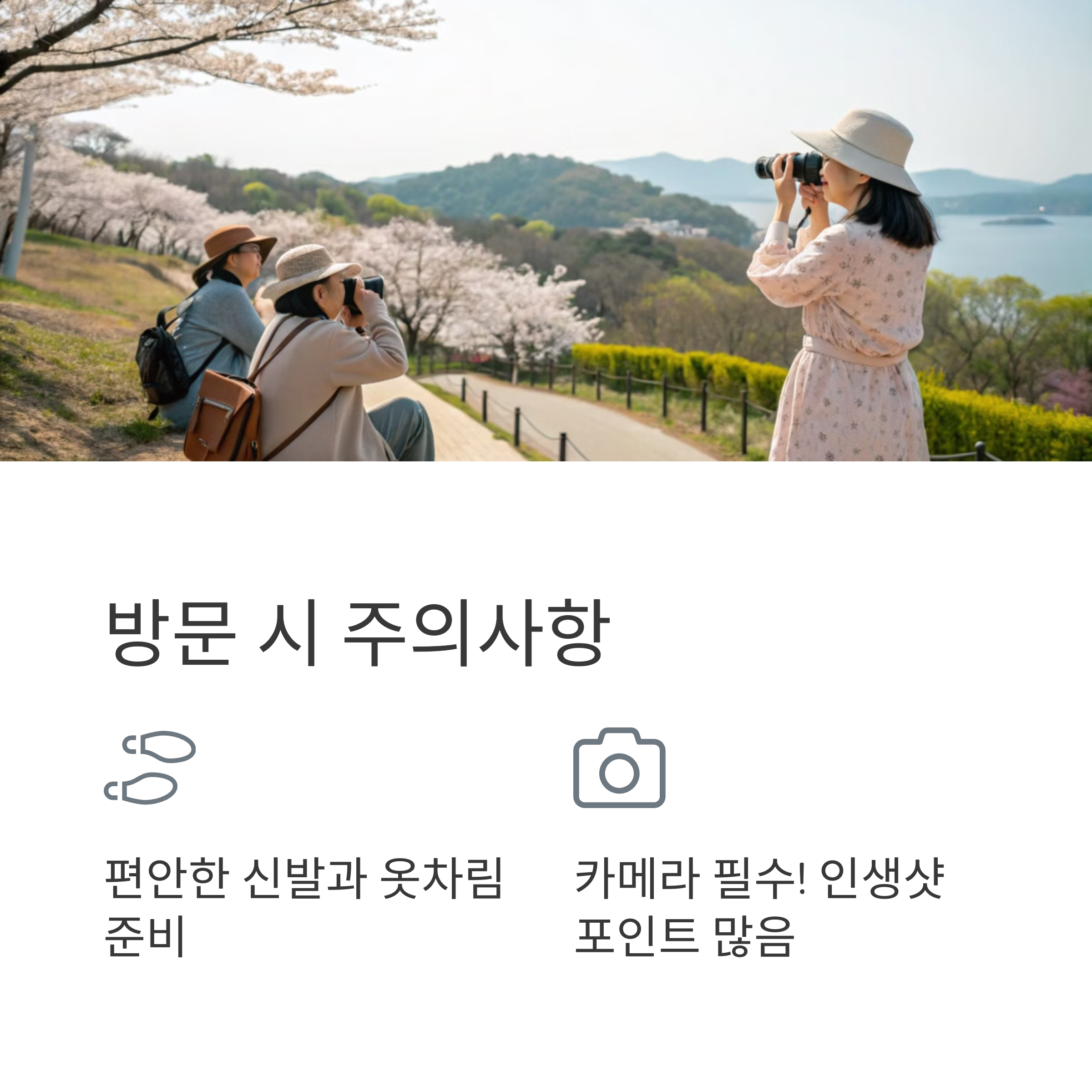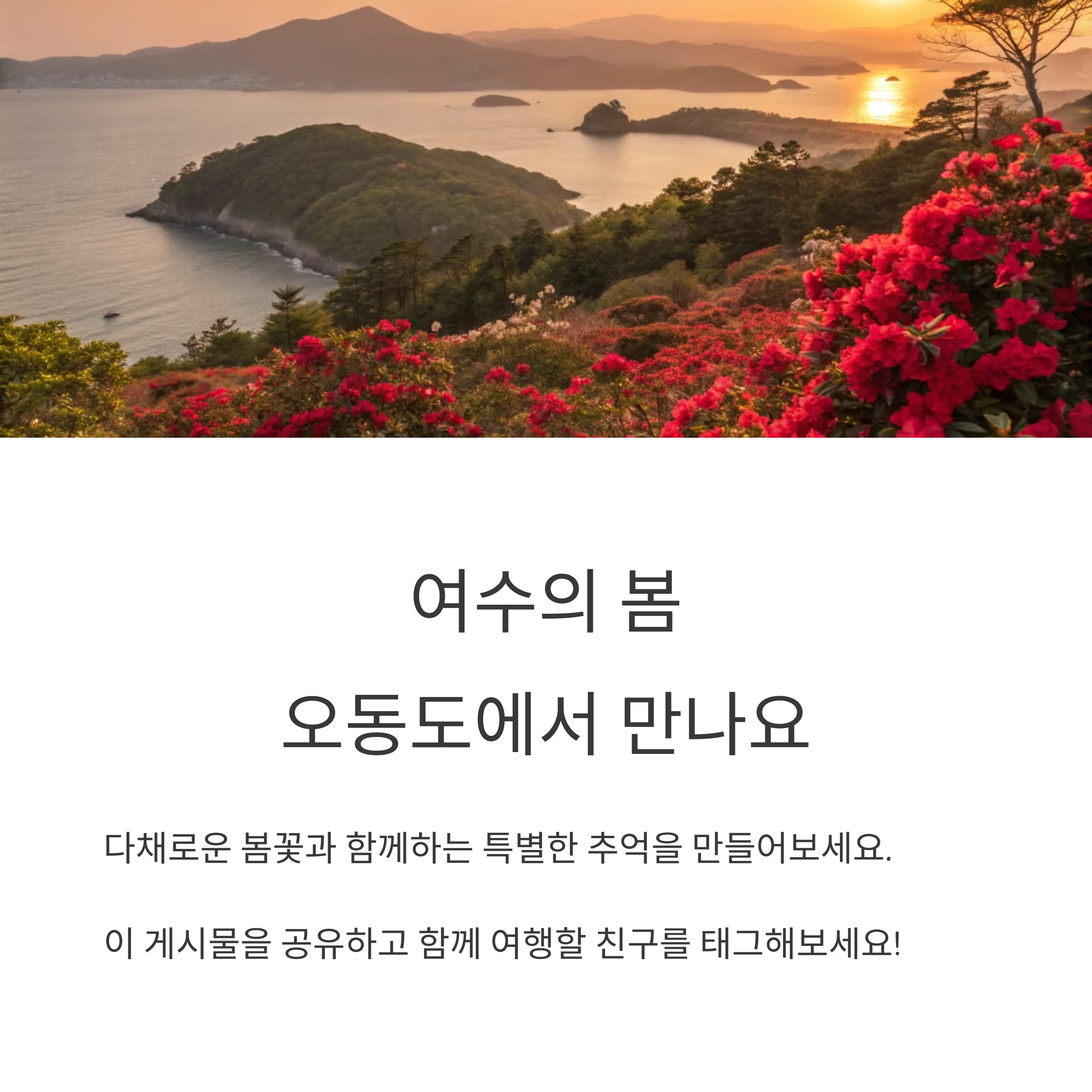 3~4월 동백꽃 시즌에 방문하면 환상적인 풍경을 감상할 수 있으며, 벚꽃까지 함께 즐길 수 있습니다. 오동도의 다양한 볼거리와 함께 여수의 봄을 만끽해 보세요!