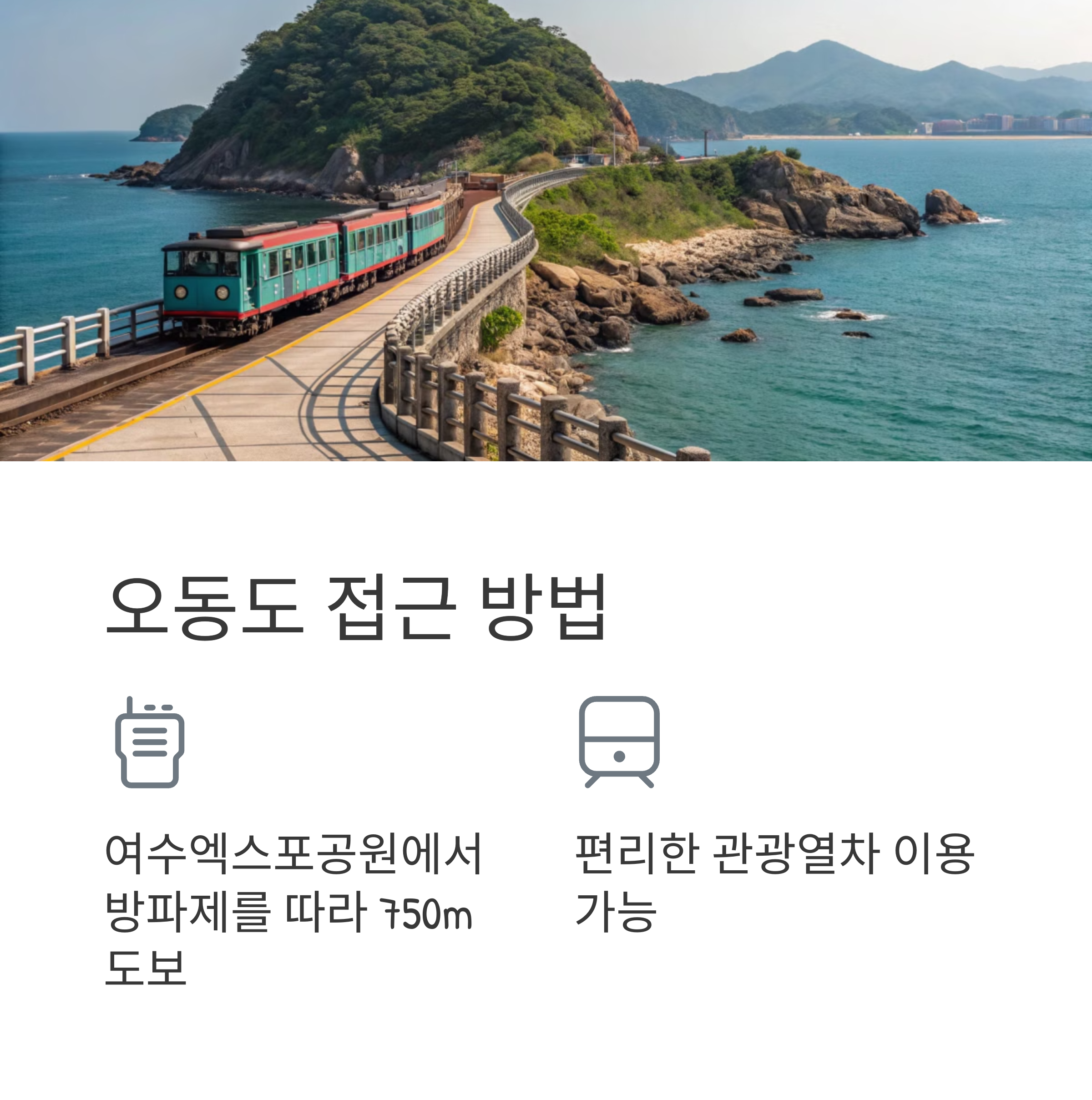 오동도에 가는 방법은 두 가지가 있습니다. 여수엑스포공원에서 방파제를 따라 750m 걸어가는 방법과 관광열차를 이용하는 방법입니다.