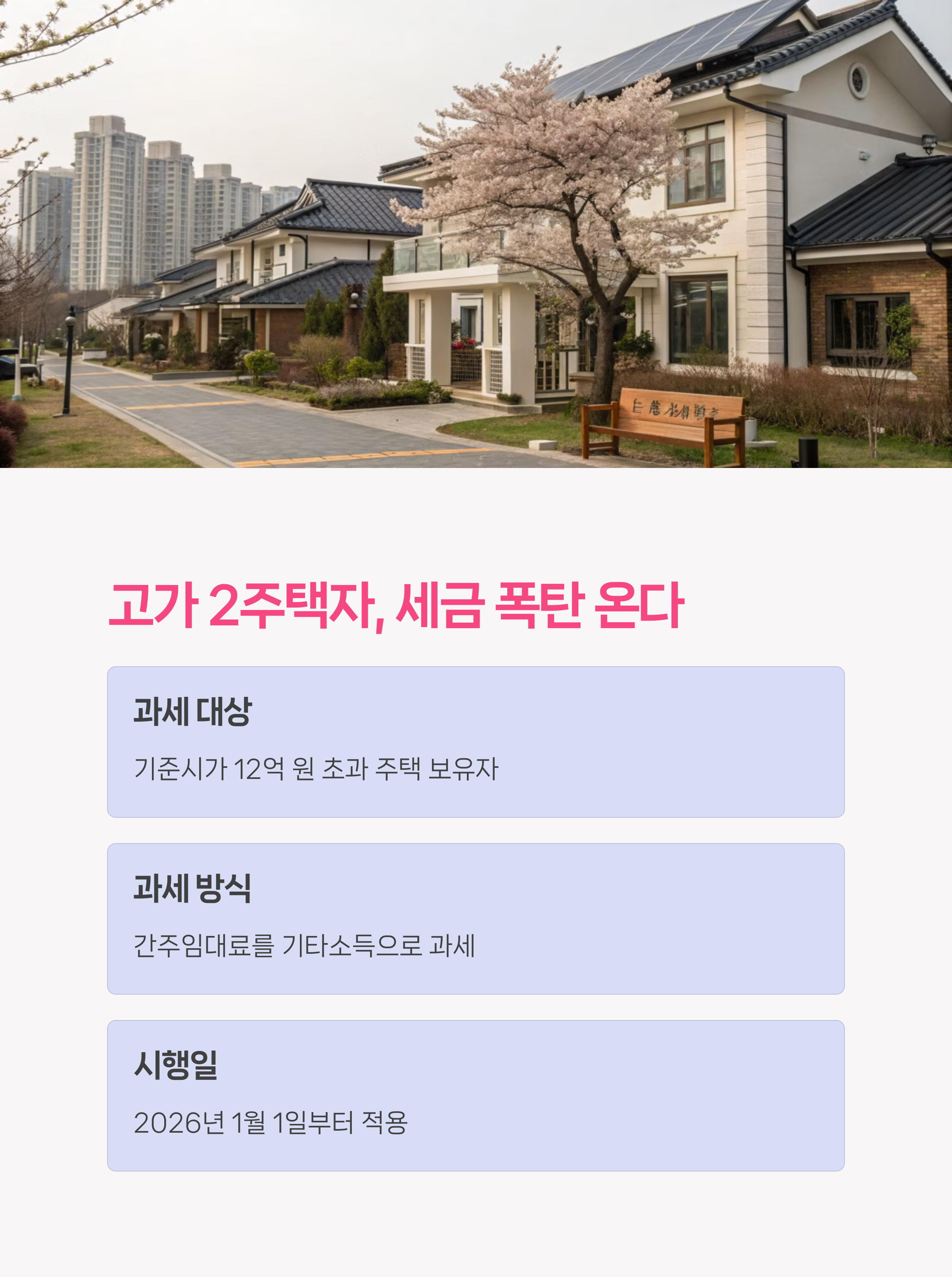 🔍 포인트: 단순한 2 주택자라도 고가 주택 보유 시 세금 부담이 발생하므로, 상속주택 포함 여부도 체크해야 합니다.