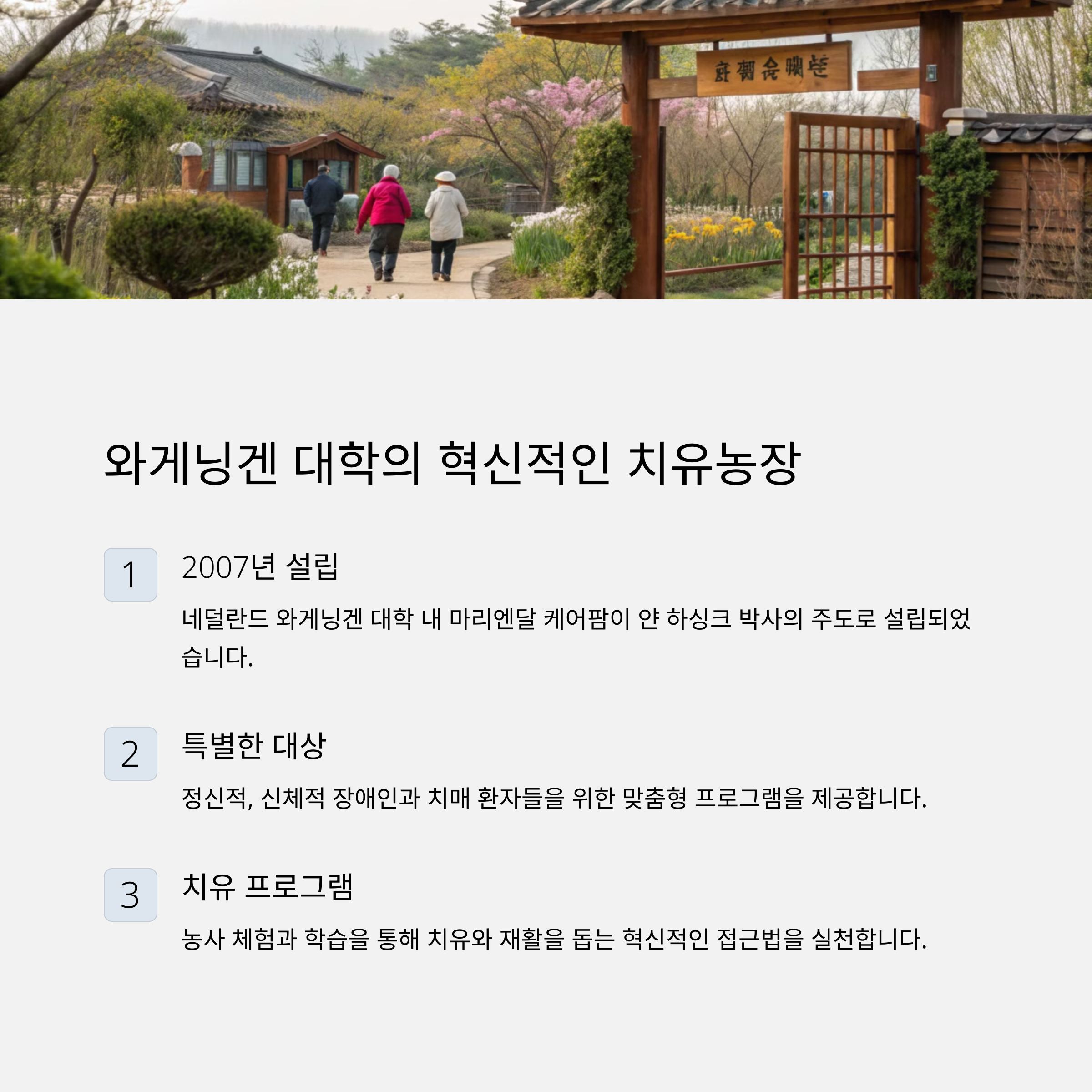 네덜란드의 치유농장은 단순한 농장이 아닙니다. 이곳은 정신적, 신체적 어려움을 가진 사람들이 자연과 교감하며 치유를 경험하는 특별한 공간입니다.