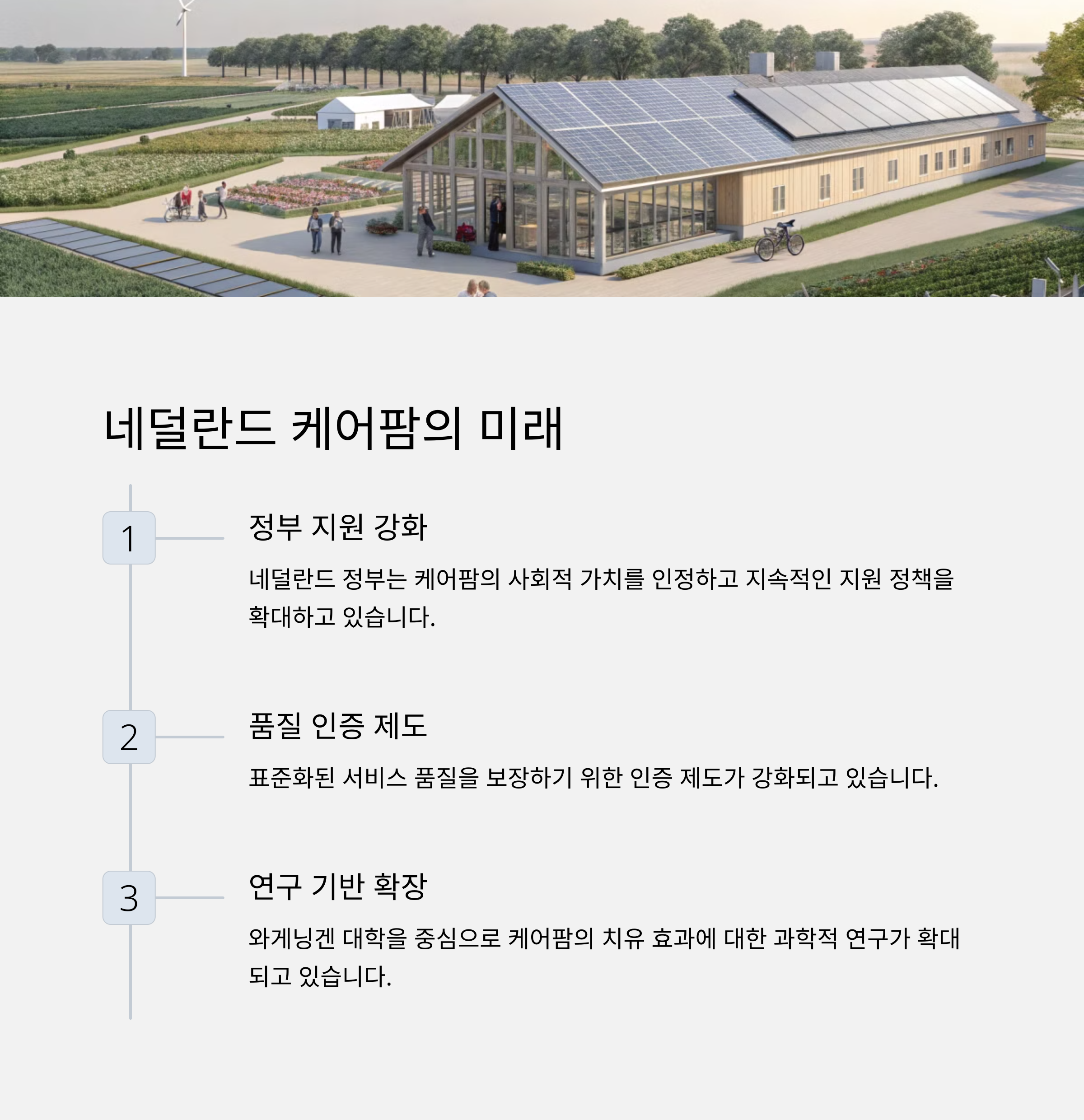 네덜란드 정부는 치유농장이 제공하는 정서적 안정과 사회 복귀 효과를 높이 평가하며, 지속적으로 정책적 지원을 확대하고 있습니다.