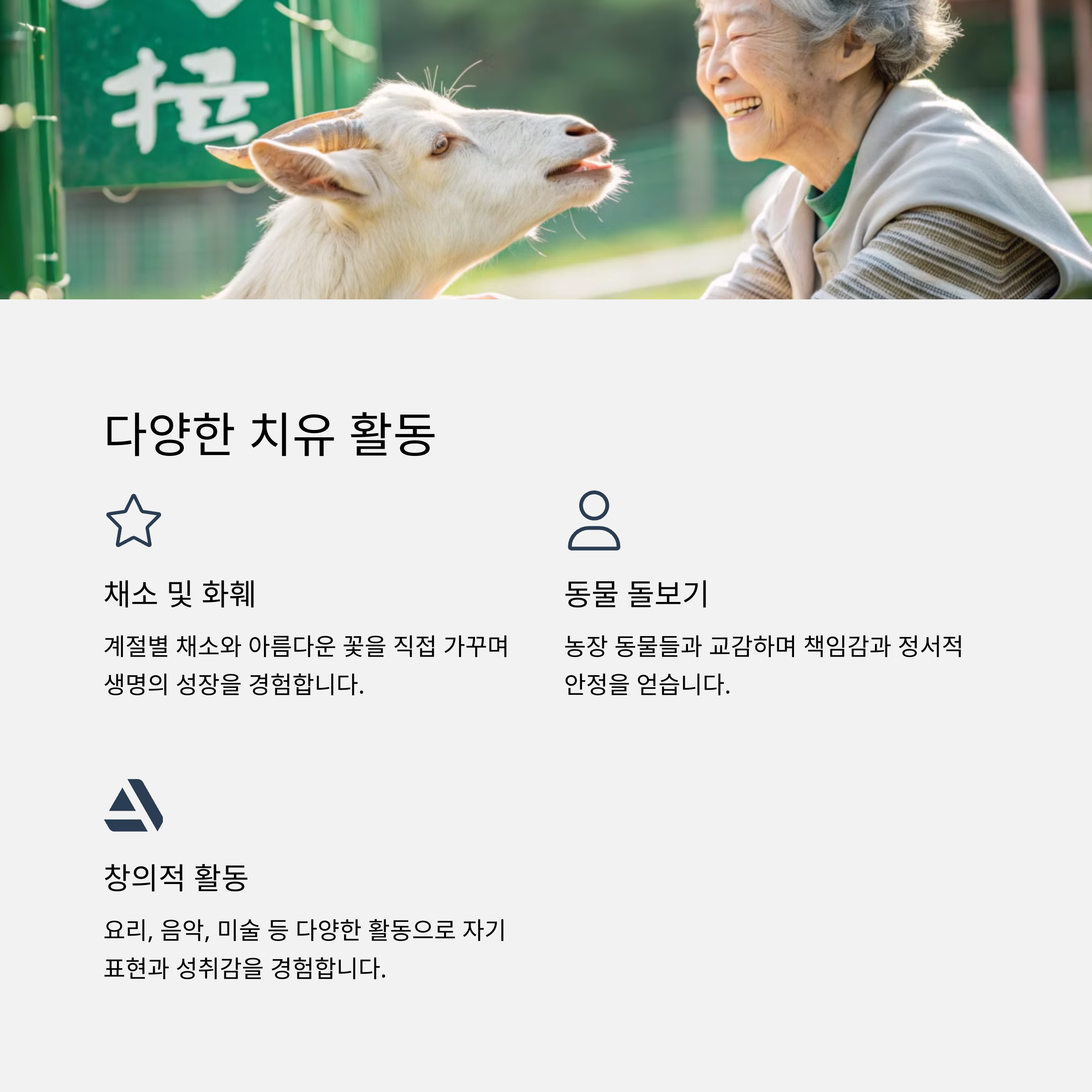 특히 동물과의 교감 활동은 참가자들에게 큰 심리적 위안을 주며, 정원 가꾸기를 통해 성취감을 느낄 수 있도록 합니다.