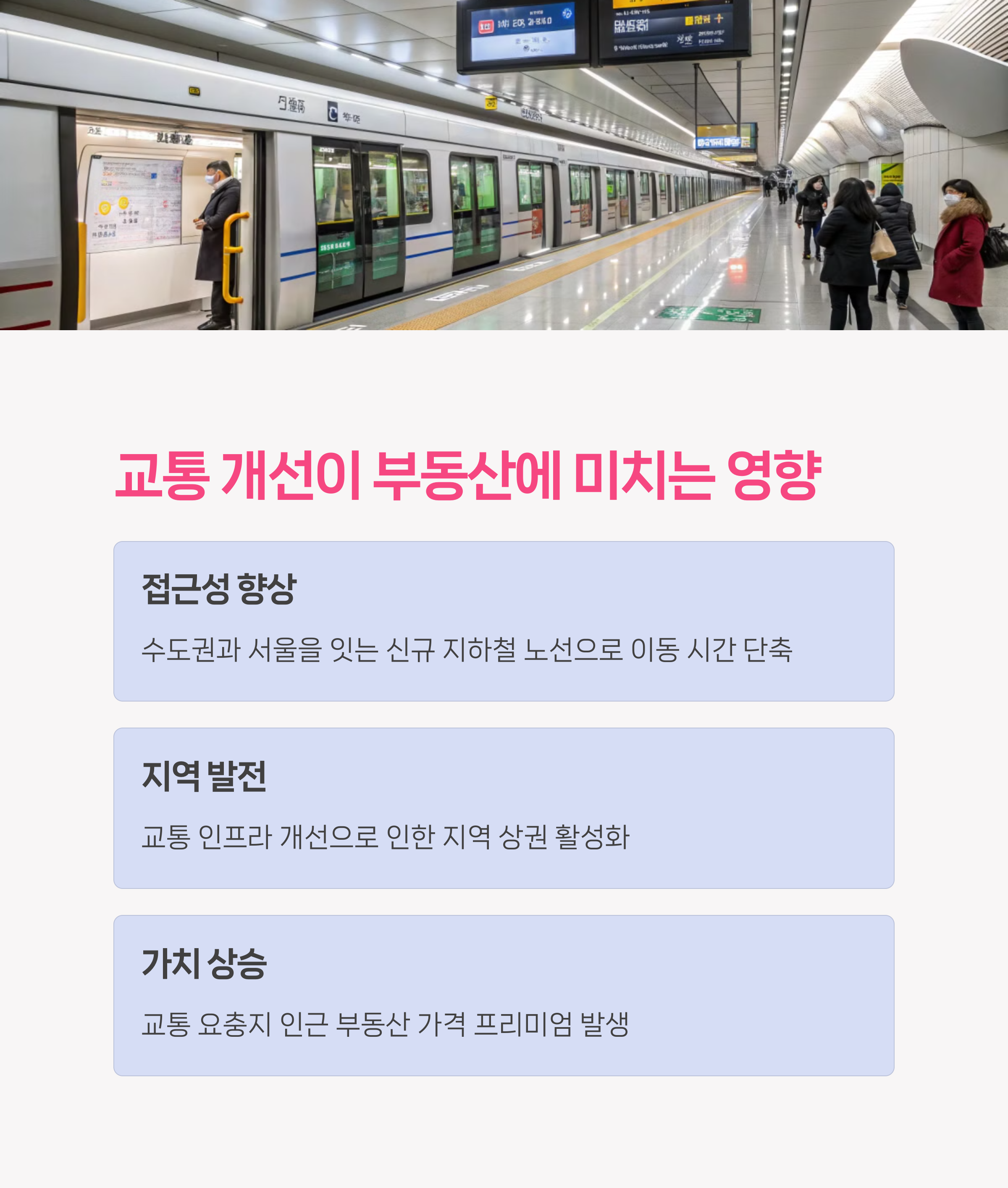 이는 해당 지역의 주민들에게 출퇴근 시간을 줄여주는 큰 호재이자, 부동산 시장에서는 '교통 프리미엄'으로 작용할 가능성이 큽니다.