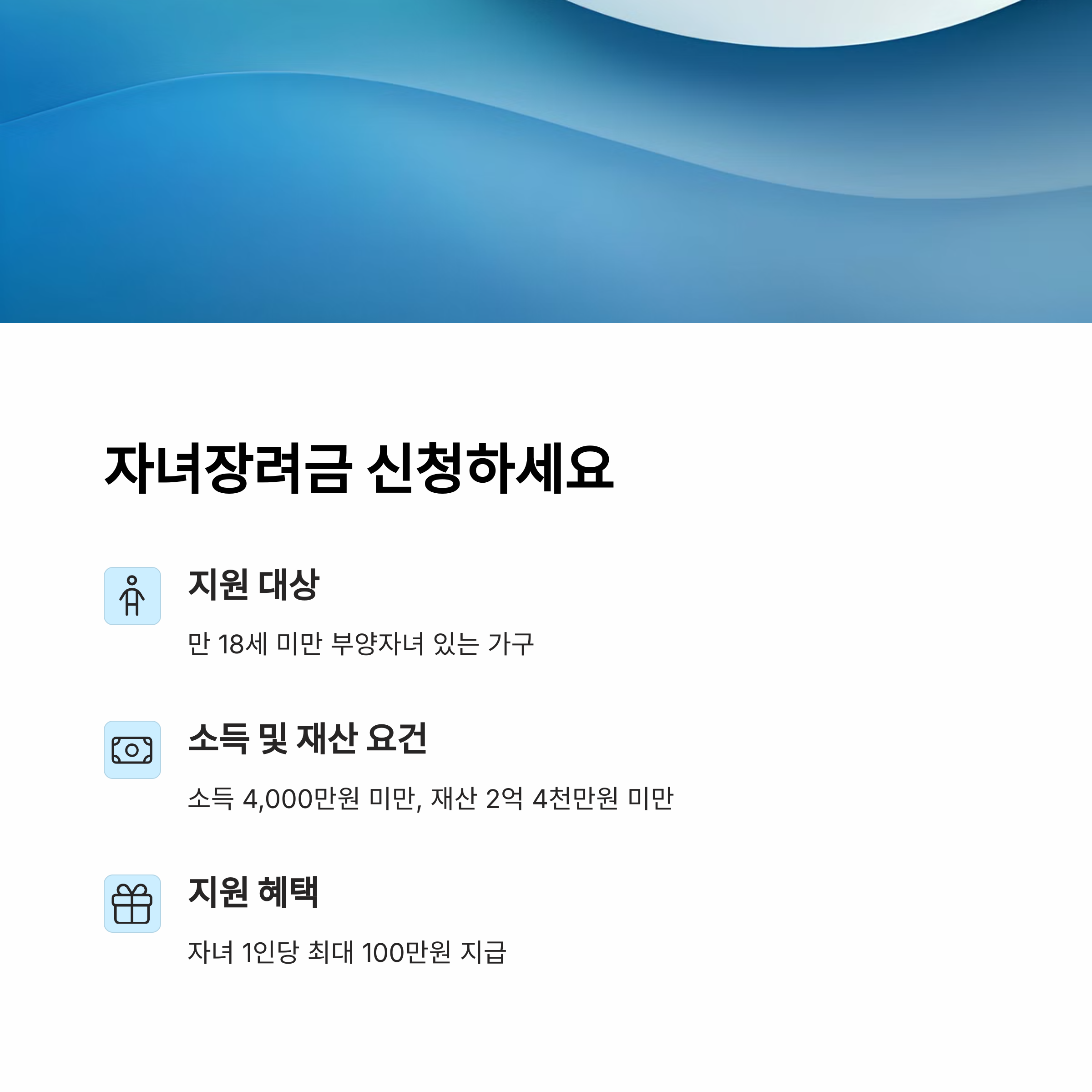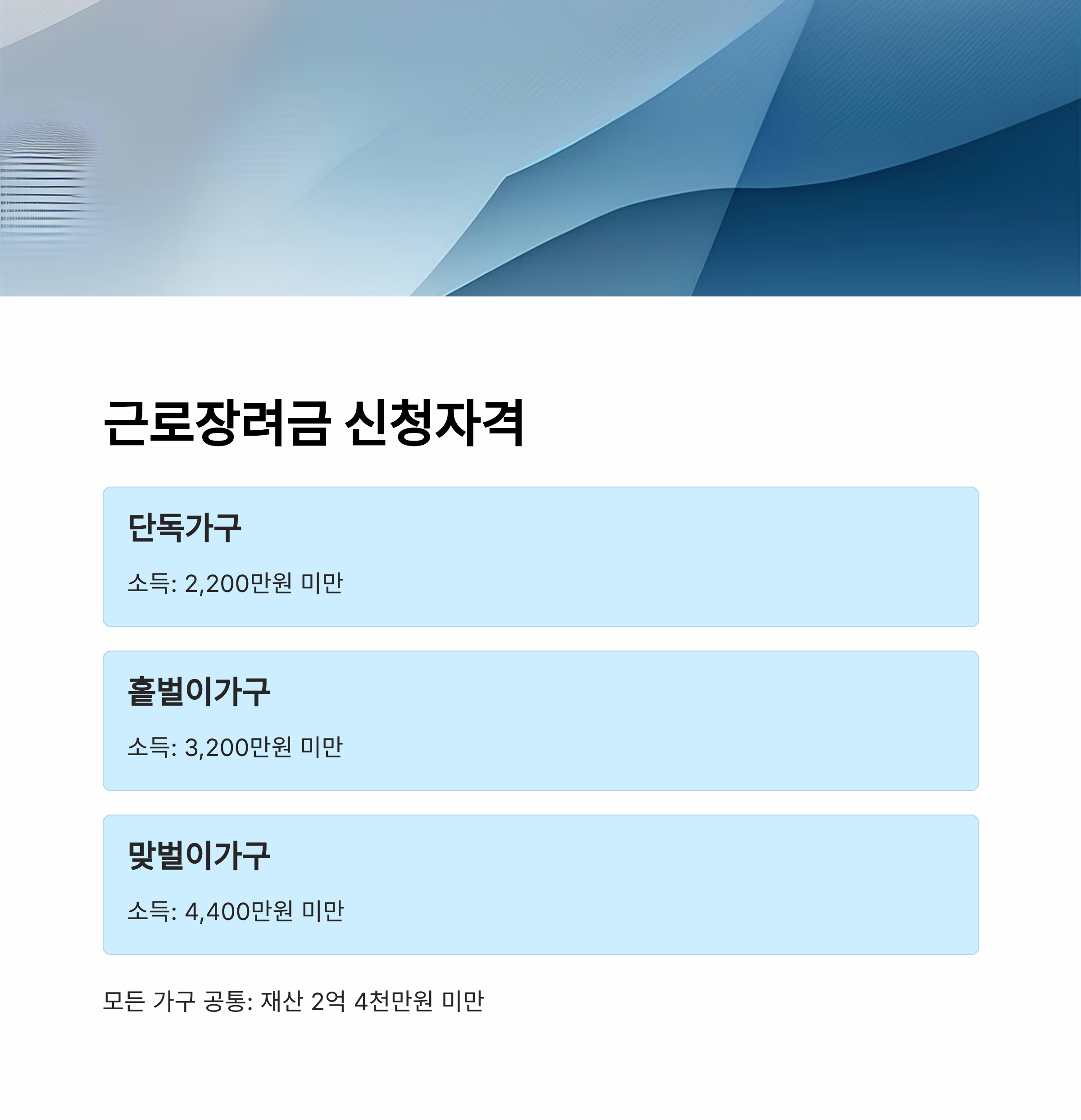 | 재산 2억 원 미만 조건도 반드시 충족해야 함 | 기한 내 신청 필수, 이후 추가 접수 어려움 | 근로장려금과 함께 중복 신청 가능 |