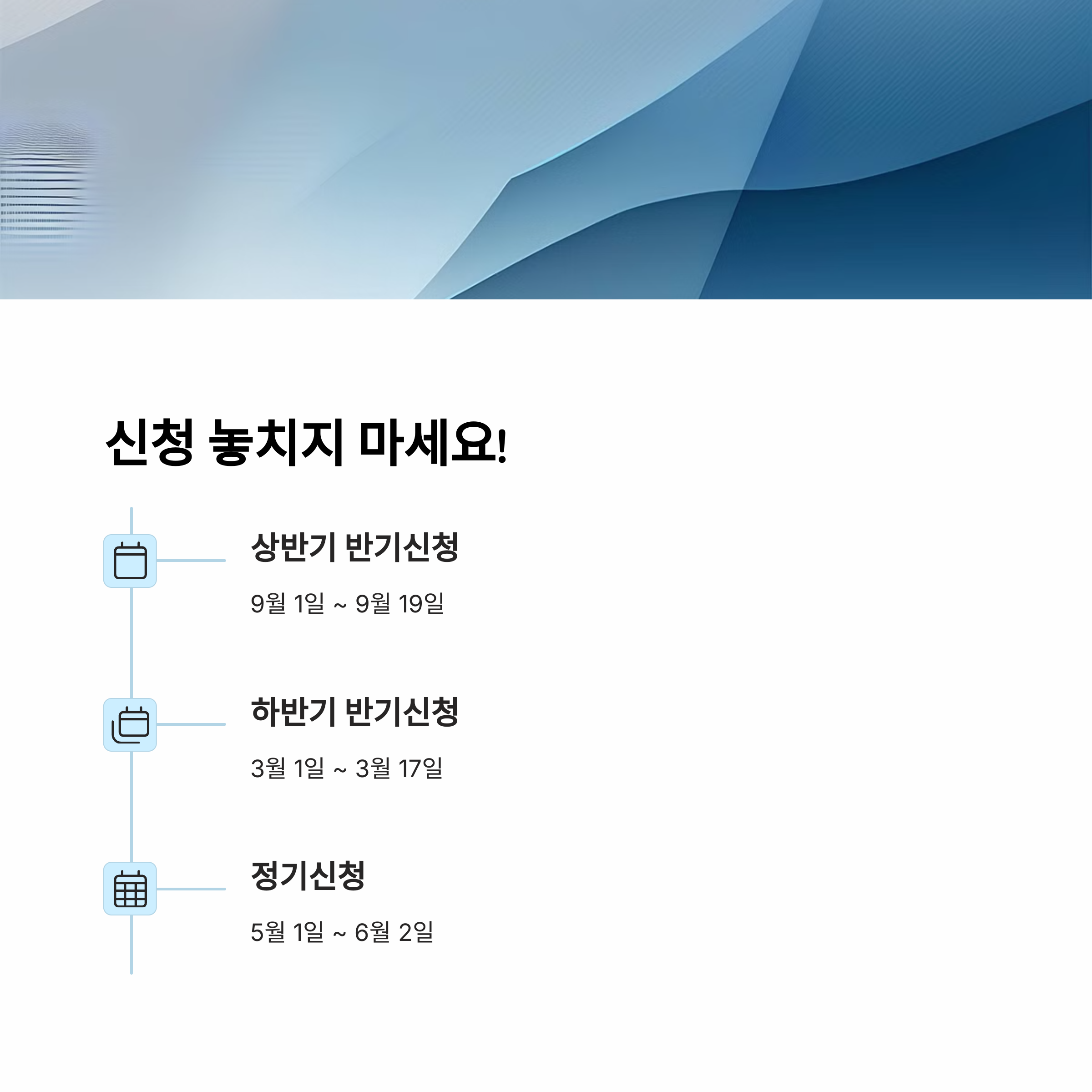 신청은 반기와 정기 두 차례로 나누어 진행되며, 3월 1일부터 17일까지는 반기 신청 기간이며, 5월 1일부터 31일까지는 정기 신청 기간입니다. ⏰