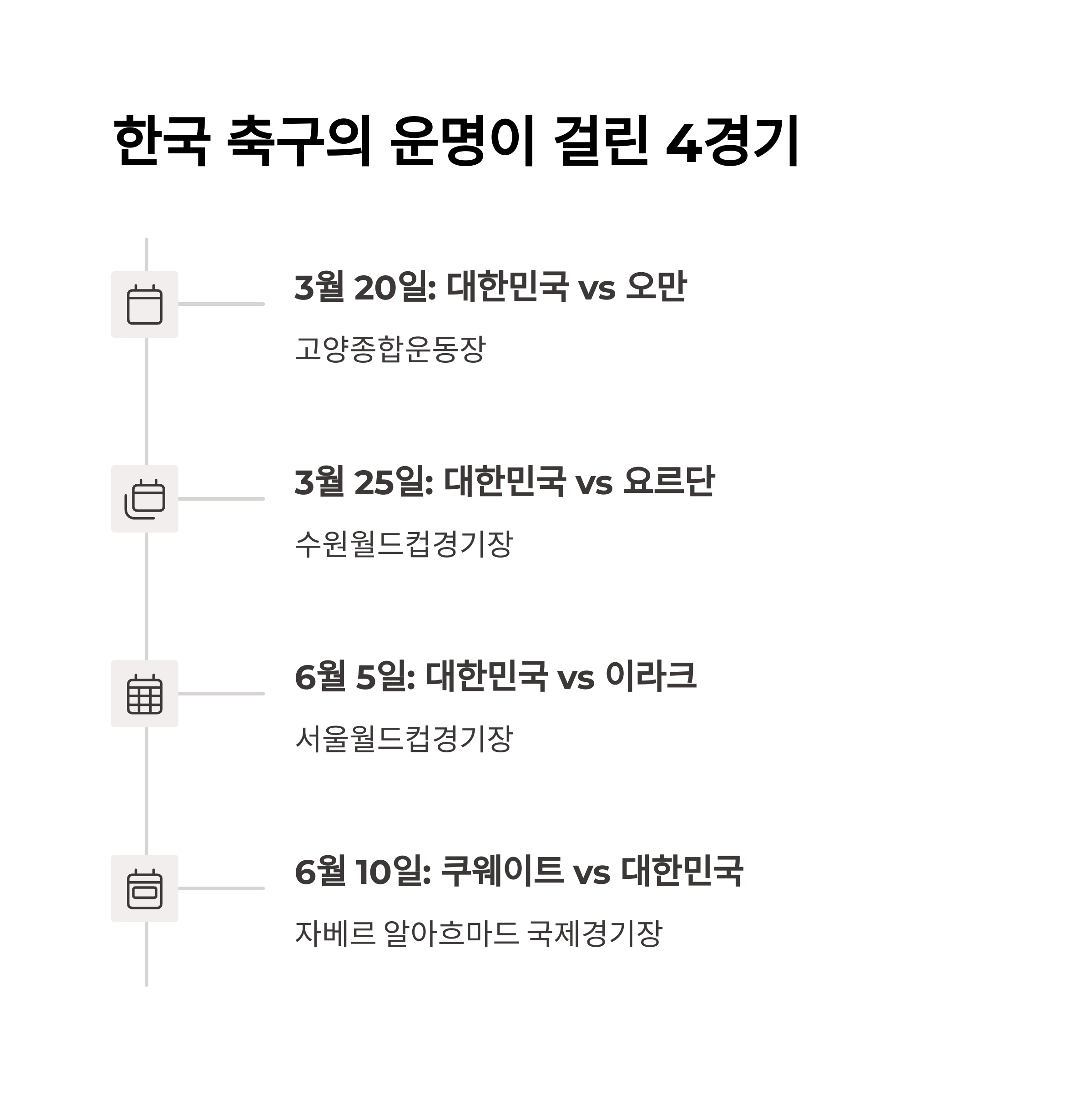 - 3월 25일: 대한민국 vs 요르단 (수원월드컵경기장)