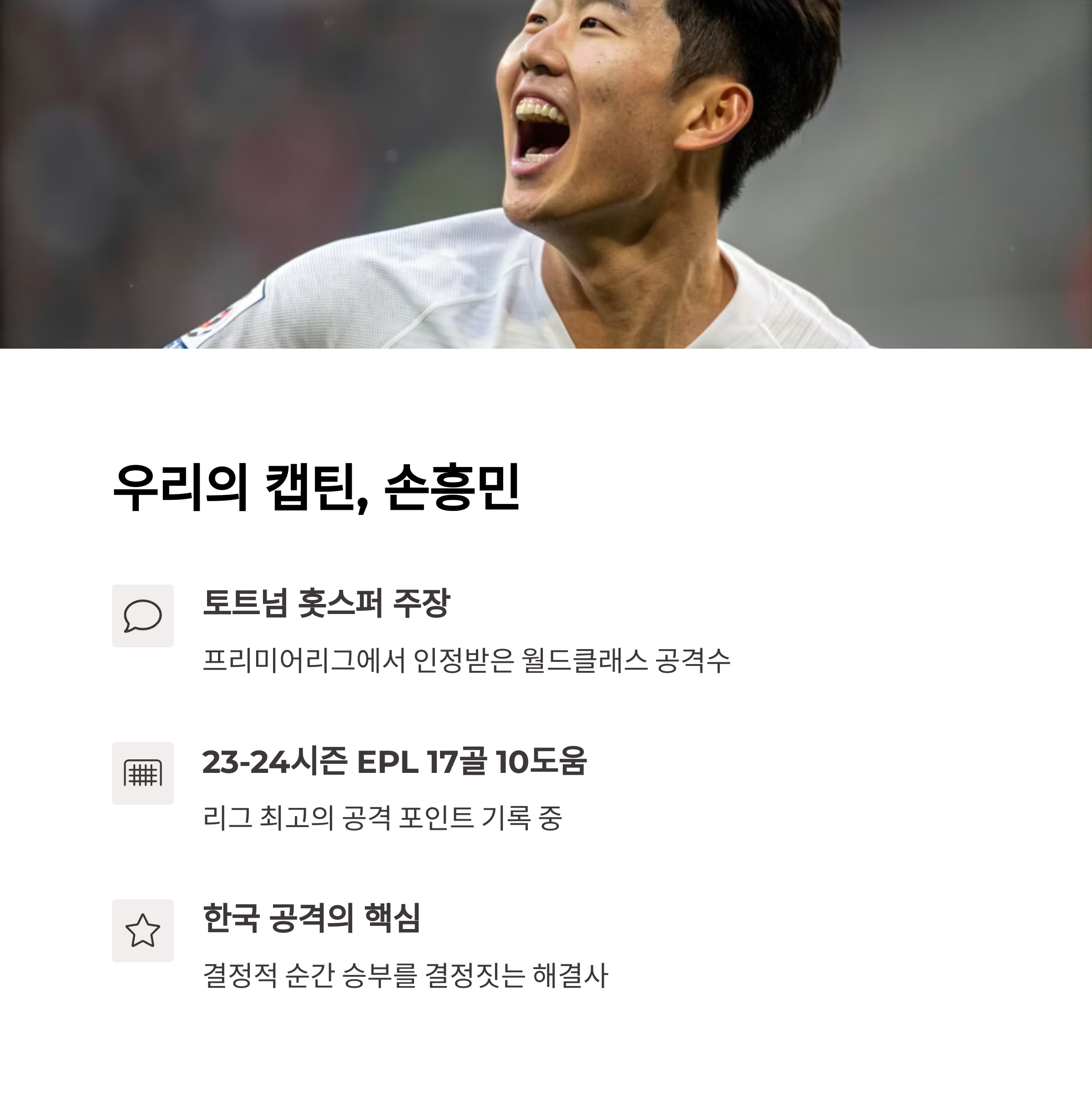 손흥민대한민국 대표팀의 대표적인 공격수로, 뛰어난 득점 능력을 자랑합니다.