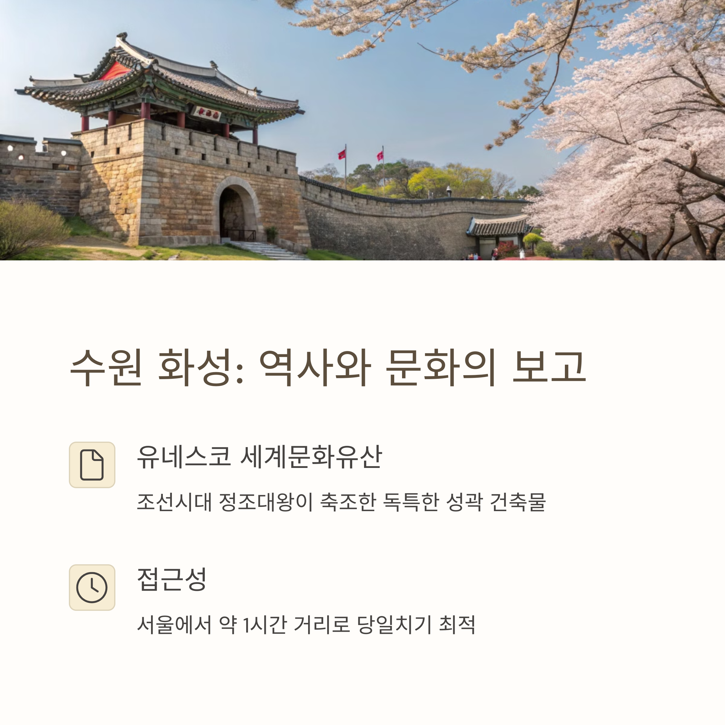 수원 화성은 유네스코 세계문화유산으로 지정된 역사적인 명소입니다. 수원 화성은 서울에서 약 1시간 거리에 위치해 있으며, 그 아름다운 성곽과 탑들이 고풍스러운 매력을 선사합니다.