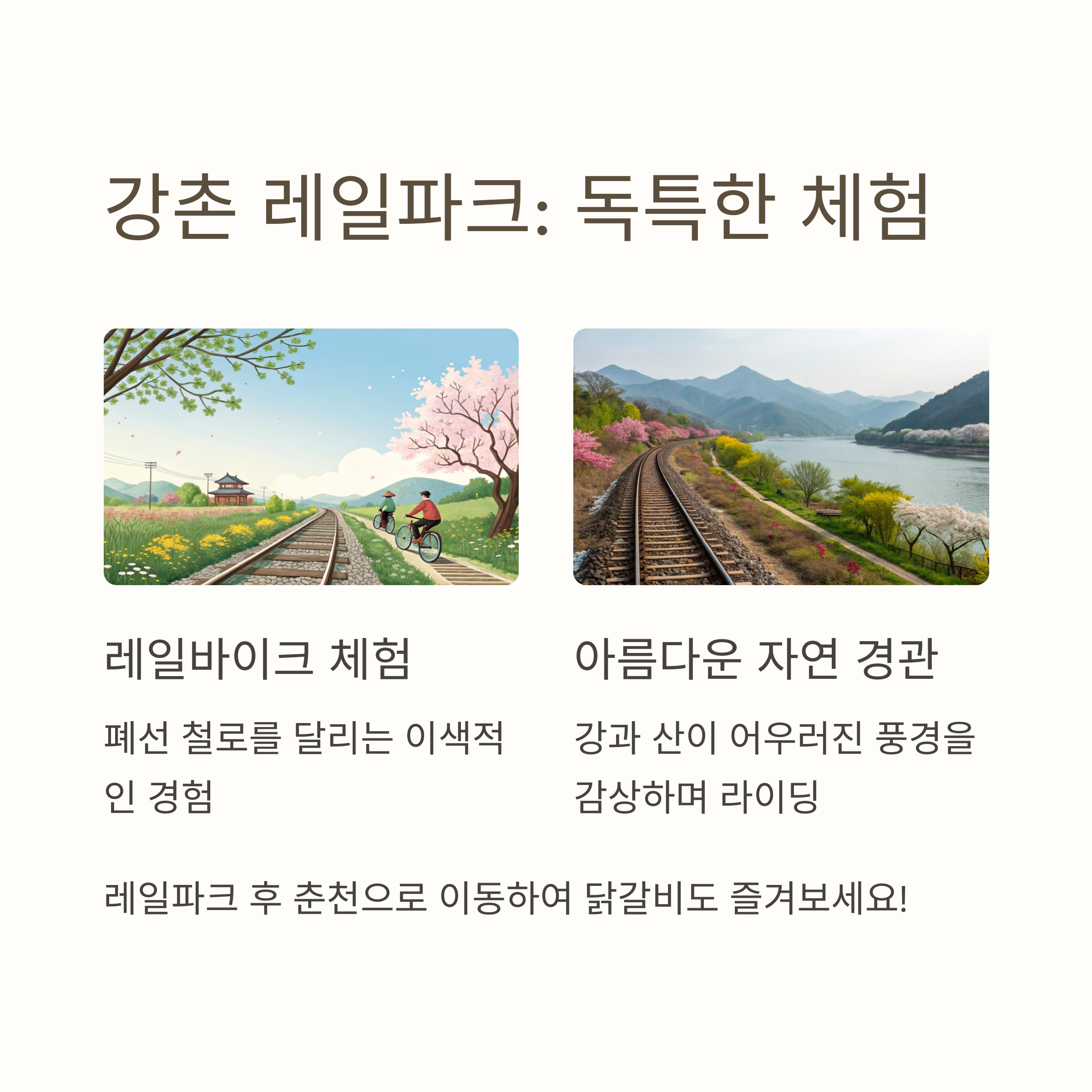 두 번째로 추천하는 여행지는 강촌 레일파크입니다. 강촌은 폐선 철로를 활용하여 레일바이크를 즐길 수 있는 곳으로, 자연 속에서 신나는 액티비티를 즐길 수 있습니다.