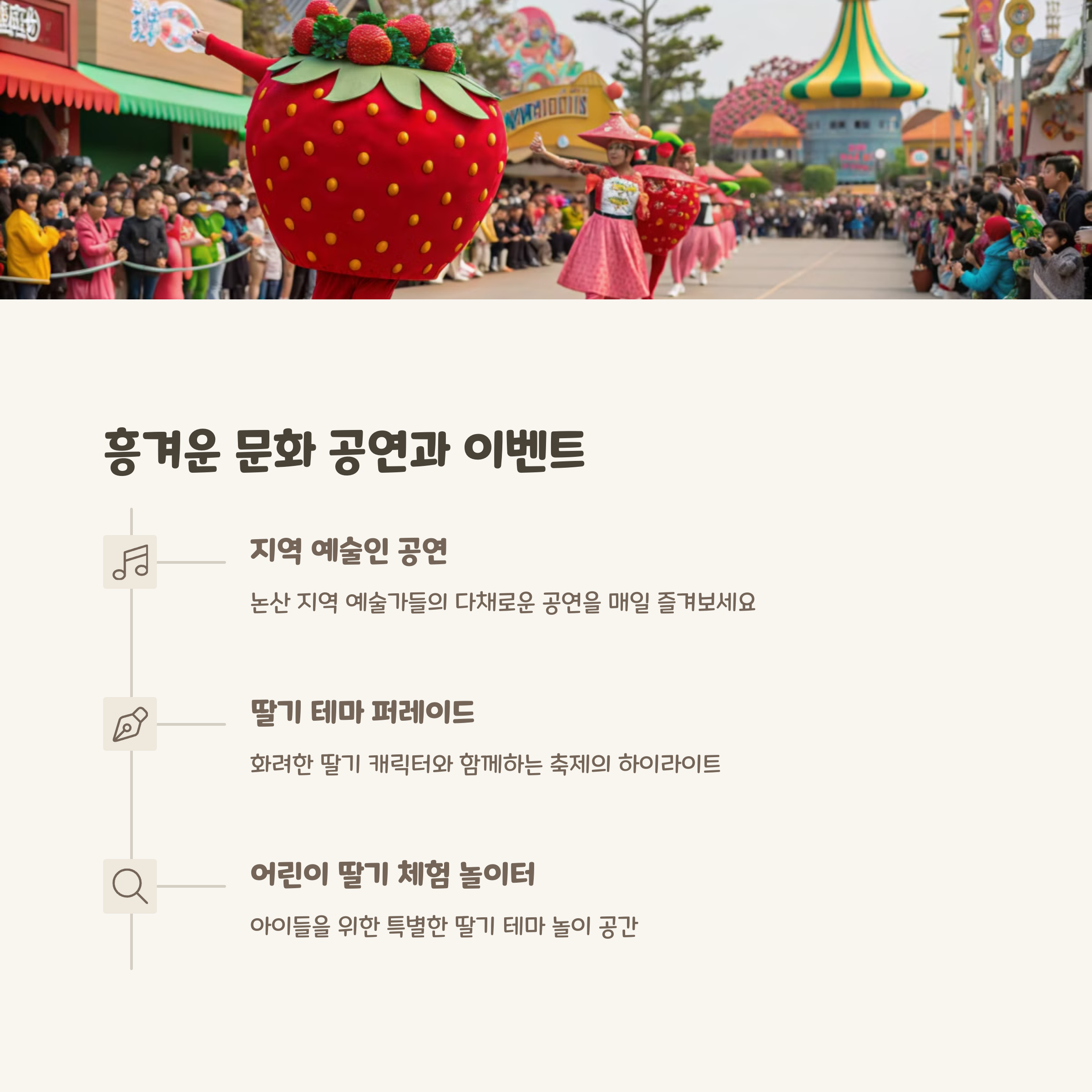 이 축제는 가족 단위 방문객들에게 특히 인기 있는 행사로, 딸기의 풍미를 직접 체험하고 즐길 수 있는 기회를 제공합니다.