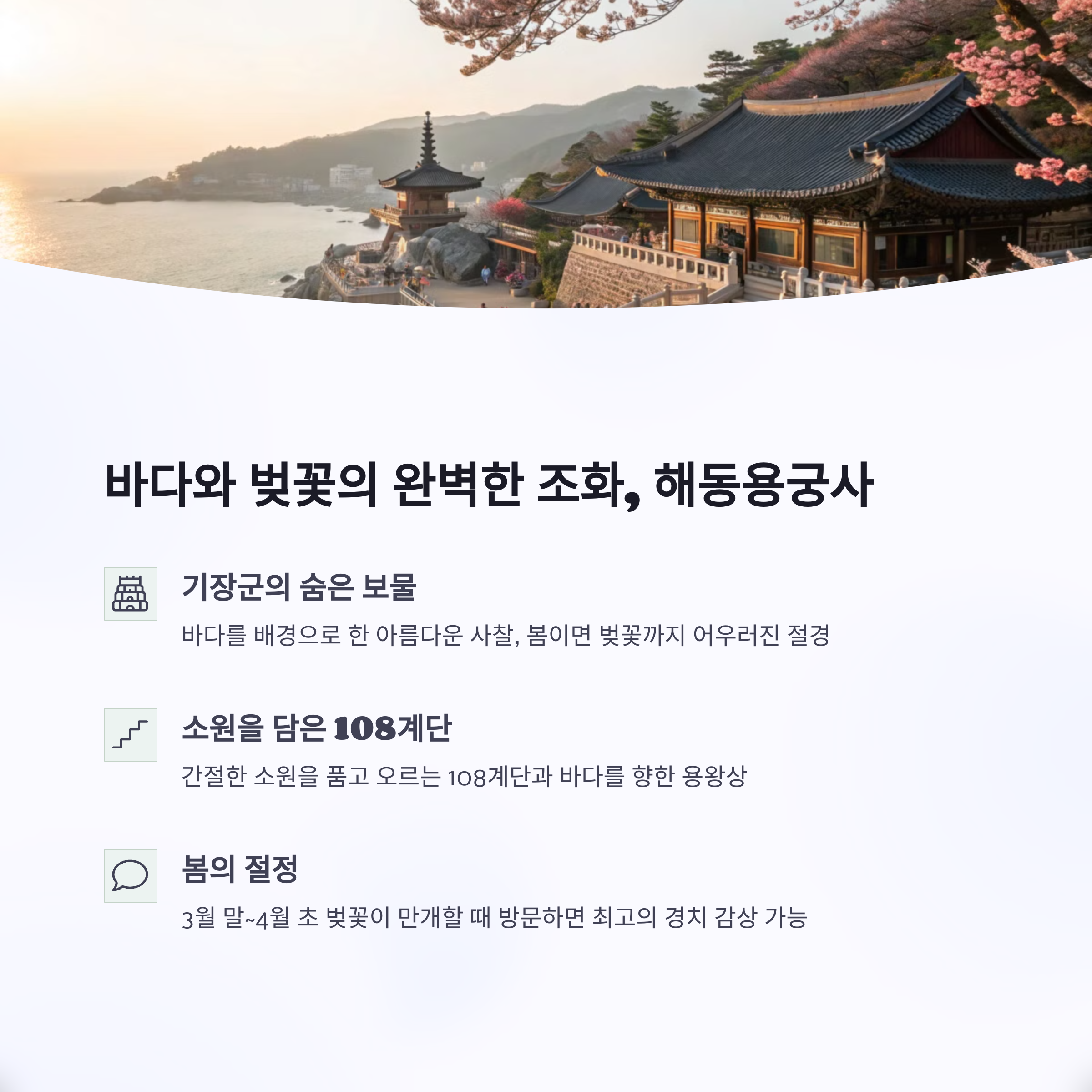 봄이면 벚꽃과 바다가 어우러져 더욱 아름다운 풍경을 선사합니다. 이곳은 소원을 빌며 오르는 108 계단과 용왕상이 유명한 명소로, 많은 사람들이 이곳에서 봄날의 기운을 느끼며 방문합니다.