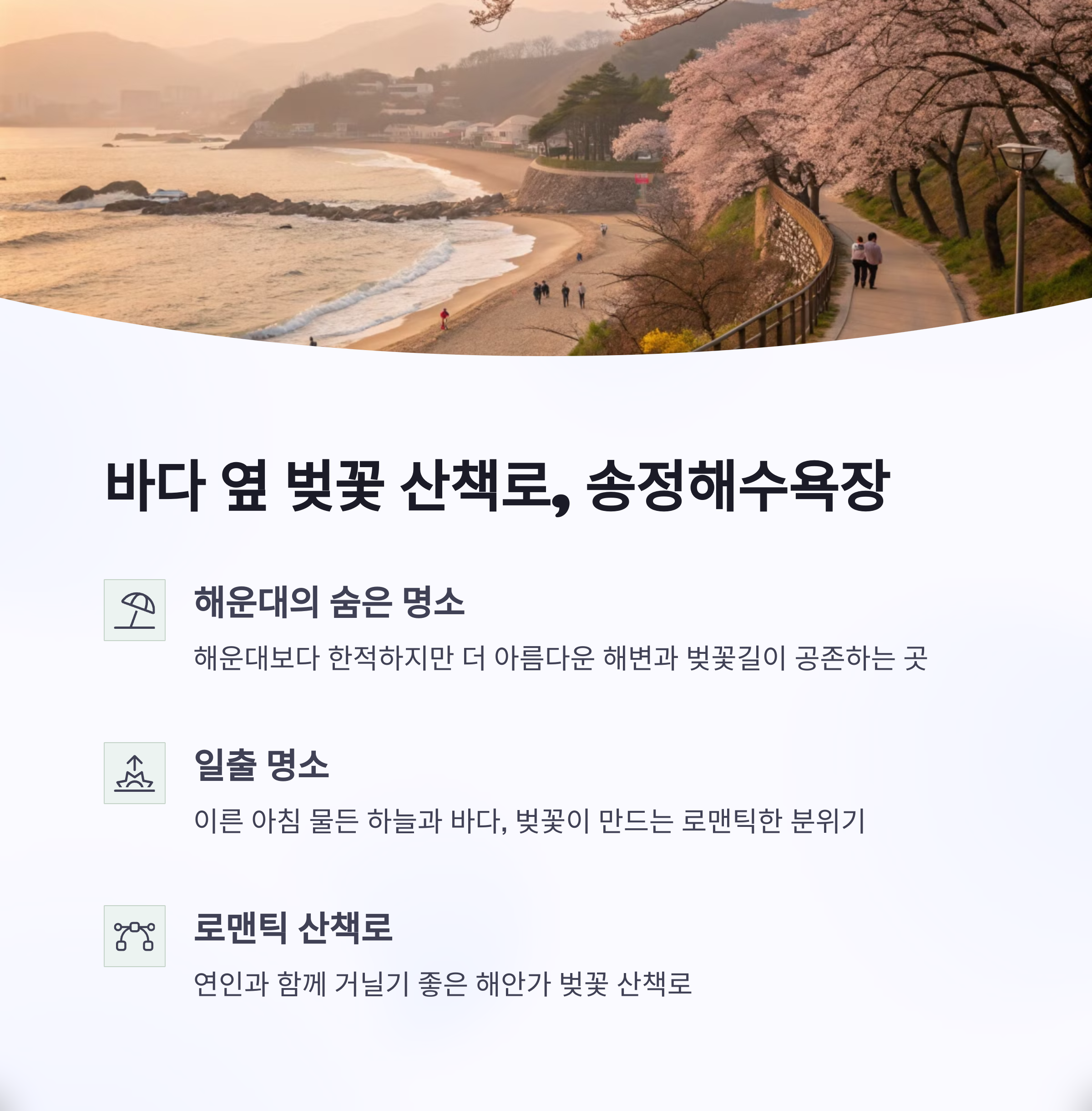 송정해수욕장은 해운대구에 위치한 아름다운 해변으로, 바다와 벚꽃길이 어우러져 산책하기에 최적의 장소입니다.