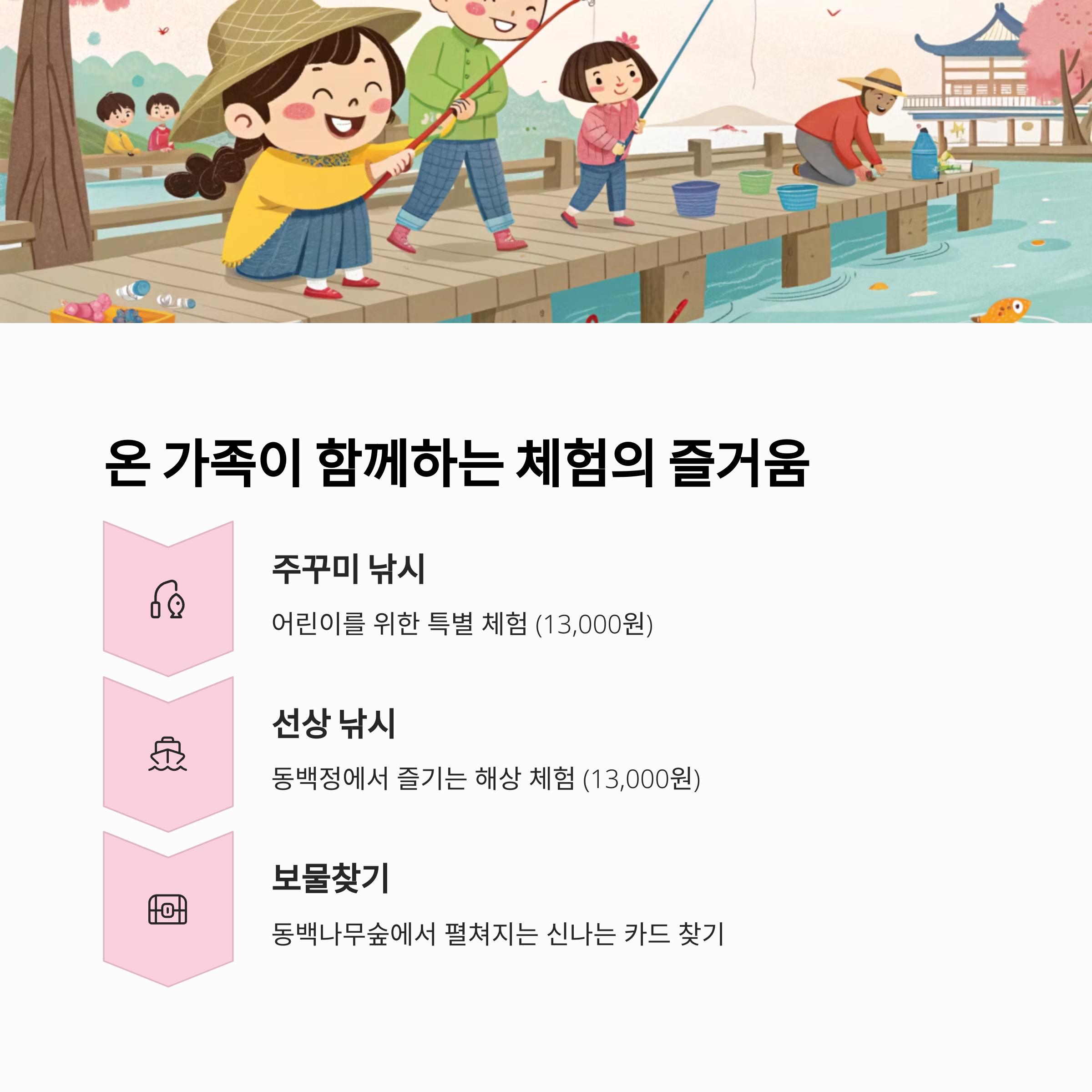 어린이 주꾸미 낚시 체험은 아이들에게 흥미진진한 경험을 선사하며, 동백정 선상 낚시 체험은 바다 위에서 자연을 만끽하며 즐길 수 있는 기회를 제공합니다.🐟
