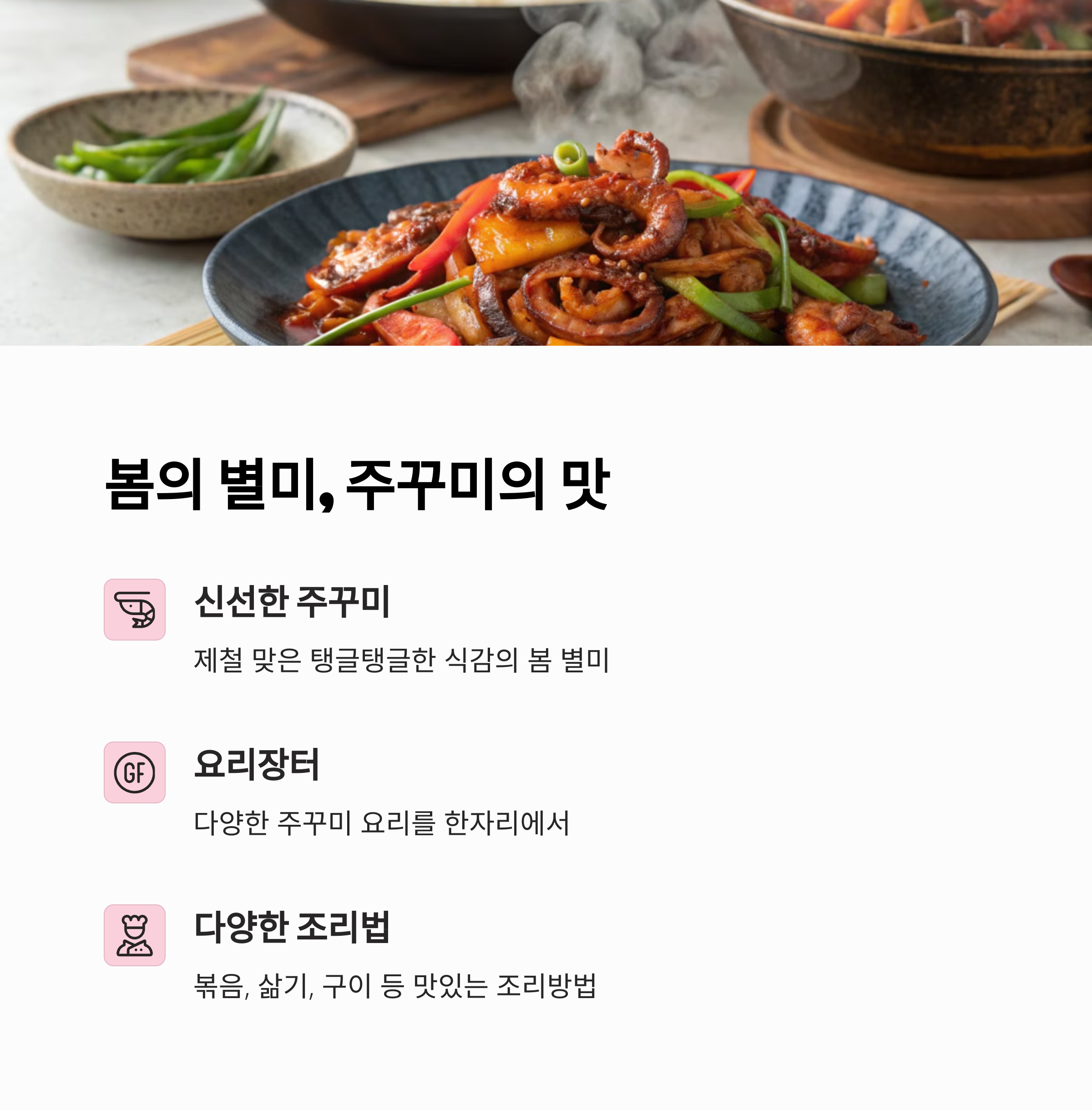 | 주꾸미 | 봄철 대표 먹거리로, 서천에서 신선한 주꾸미를 맛볼 수 있습니다. |