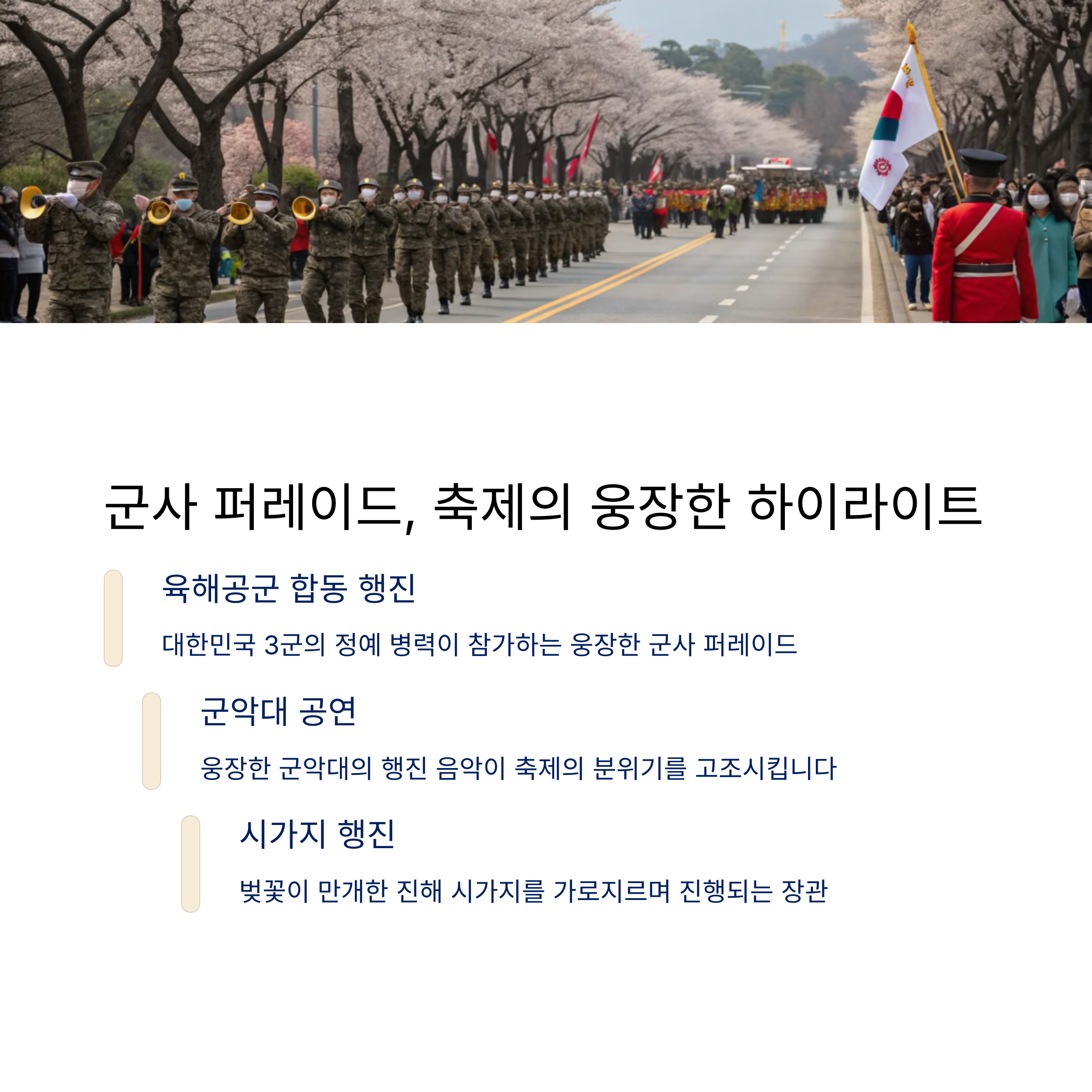 해군 전통과 군사 퍼레이드, 블랙이글스 공중쇼 등의 특별 이벤트를 통해 다양한 경험을 선사합니다. 진해 군항제는 매년 많은 사람들이 찾는 명소이며, 이번 해에도 많은 이들의 관심을 끌 것입니다.😆