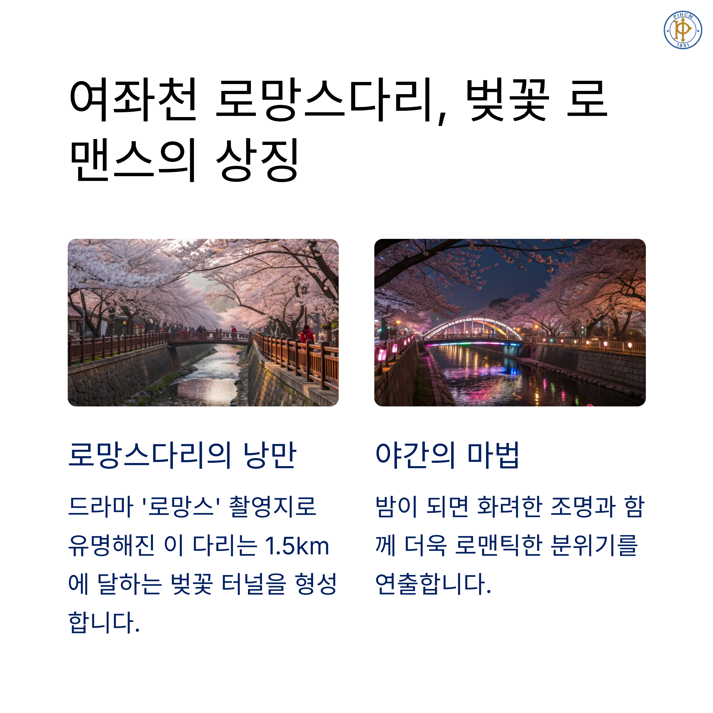 여좌천은 진해의 대표적인 벚꽃 명소로, 로망스다리가 위치해 있습니다. 이 다리는 2002년 MBC 드라마 '로망스'의 촬영지로 유명해졌습니다.