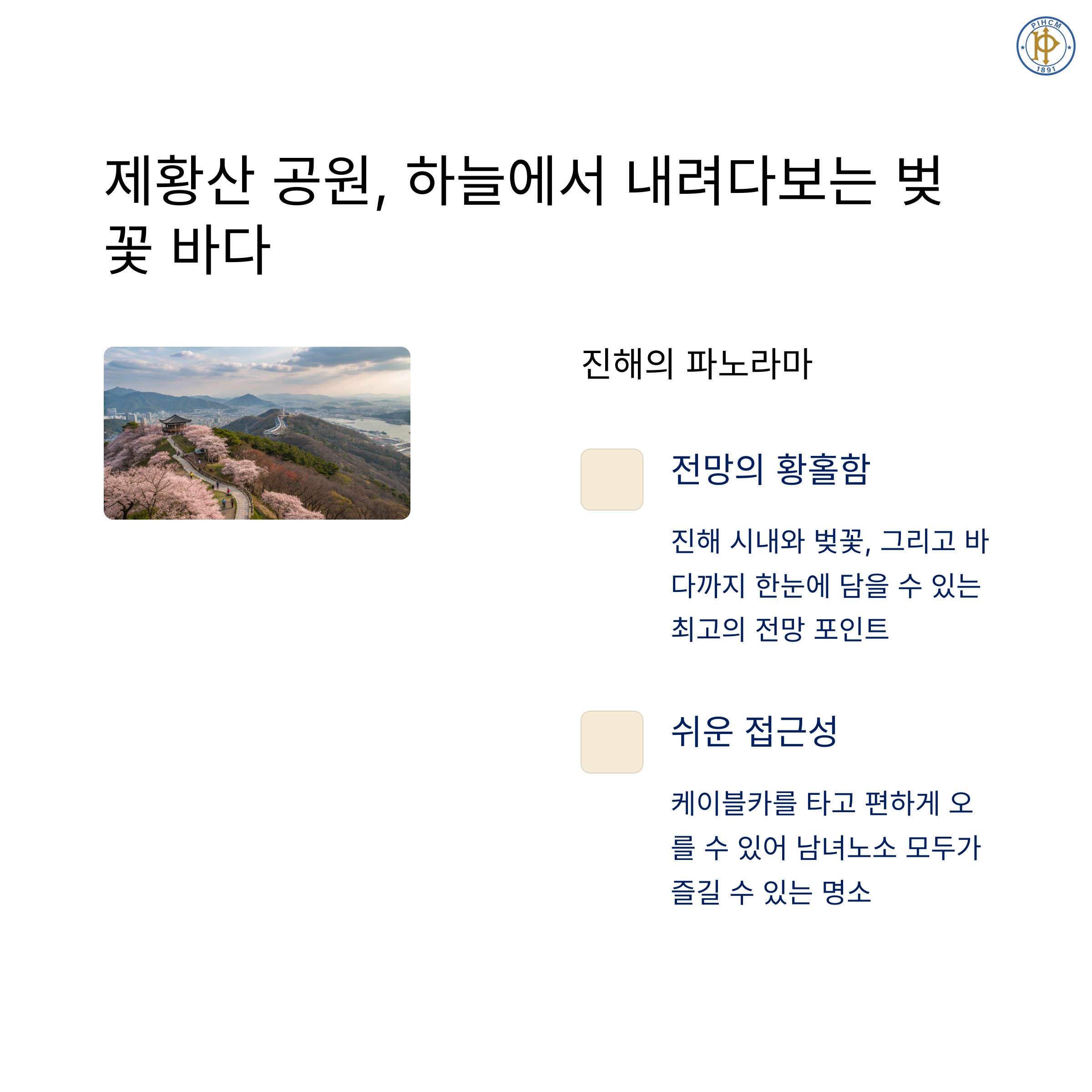 또 다른 명소인 제황산 공원은 진해 전경을 한눈에 볼 수 있는 최고의 전망을 자랑하며, 벚꽃과 함께 아름다운 자연을 감상할 수 있는 곳입니다. 진해 해군기지 축제에서는 해군의 전통과 문화를 체험할 수 있는 다양한 행사들이 열립니다.🎈