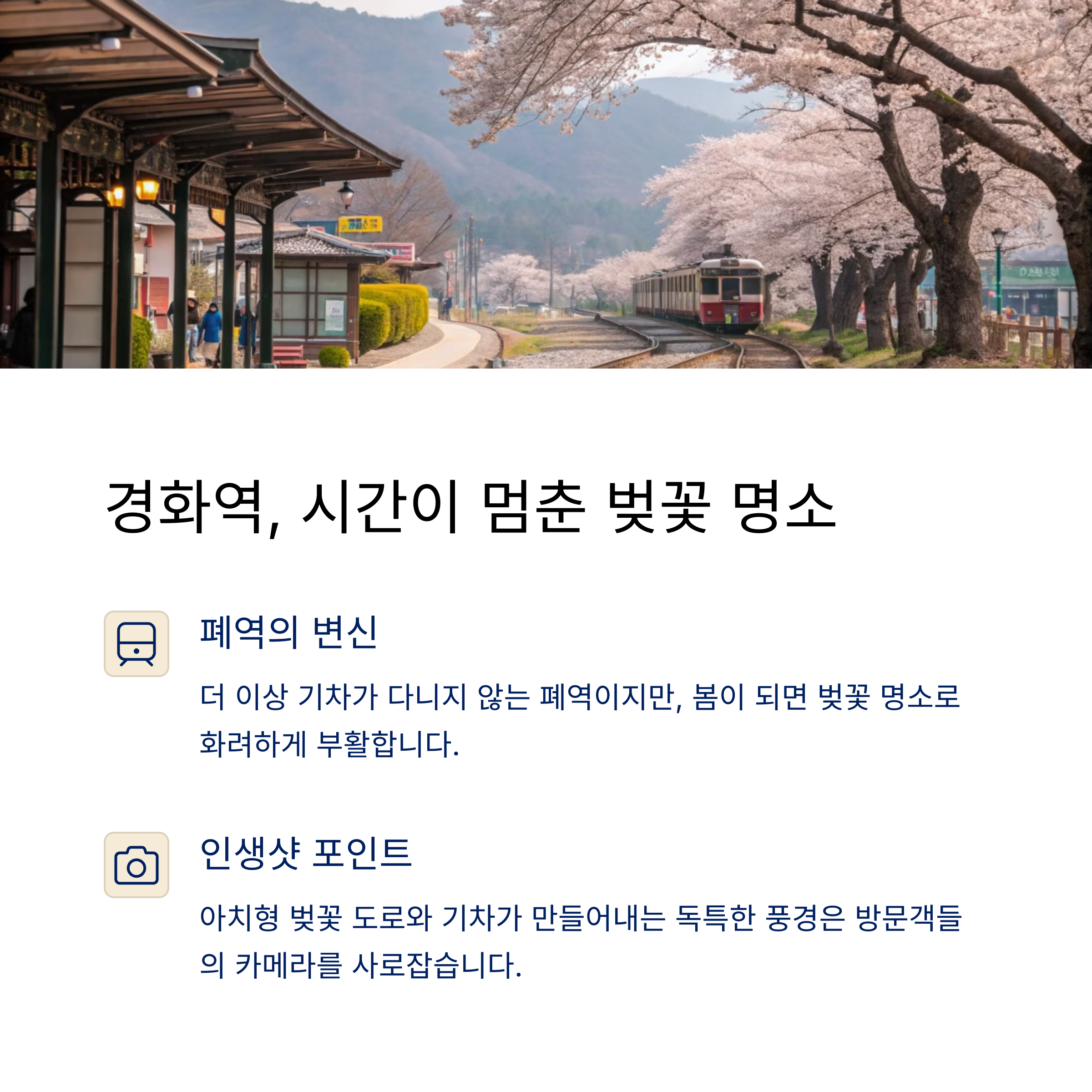 진해 군항제 기간 중, 가볼만한 곳들이 많습니다. 경화역은 벚꽃이 아치형으로 길을 따라 펼쳐지는 아름다운 장소로 유명합니다.