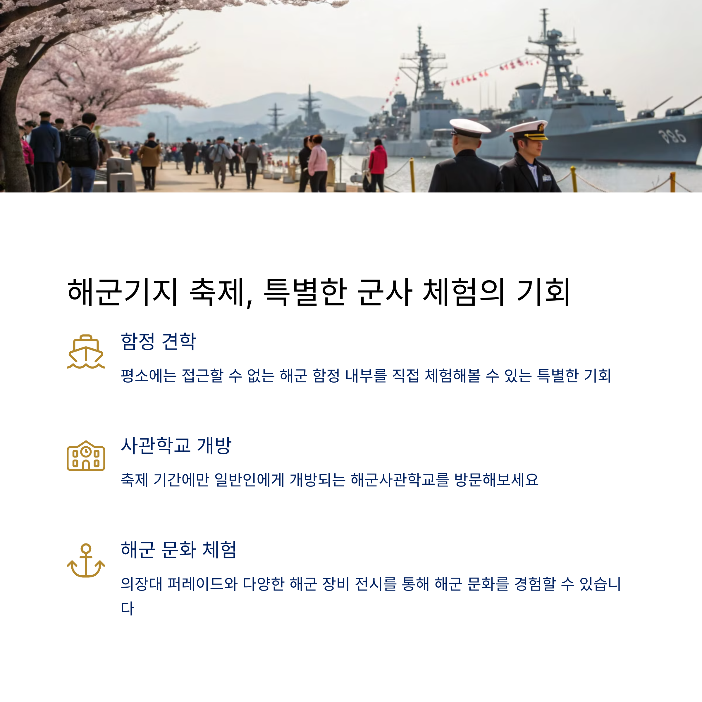 군항제는 단순히 벚꽃을 즐기는 것뿐만 아니라, 해군의 역사와 문화를 체험하는 기회를 제공합니다.