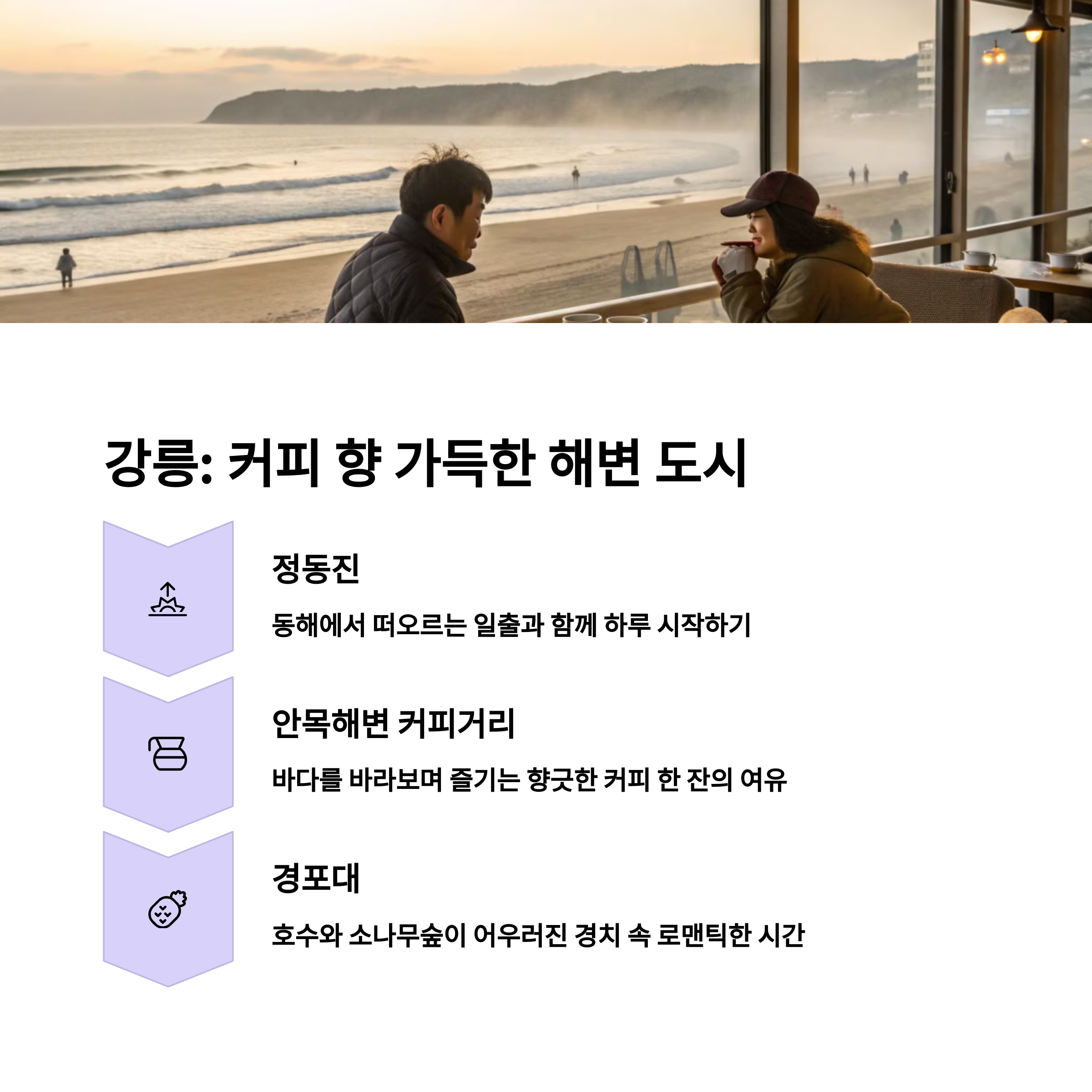 강릉은 자연과 문화를 동시에 즐길 수 있는 곳으로, 커플들에게 편안하고 여유로운 여행을 제공합니다.