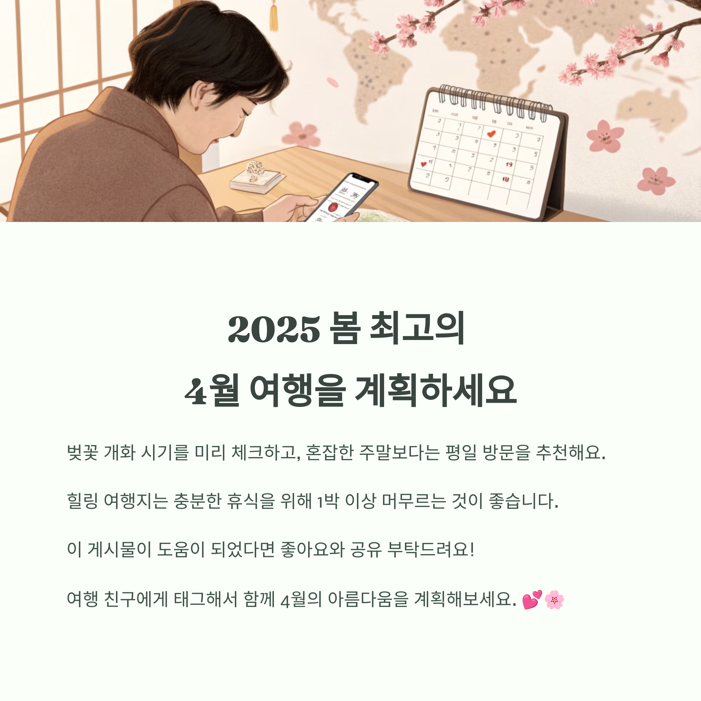 서울, 강릉, 진해와 같은 벚꽃 명소뿐만 아니라 제주도와 산청 같은 힐링 여행지에서도 아름다운 자연을 경험할 수 있습니다.