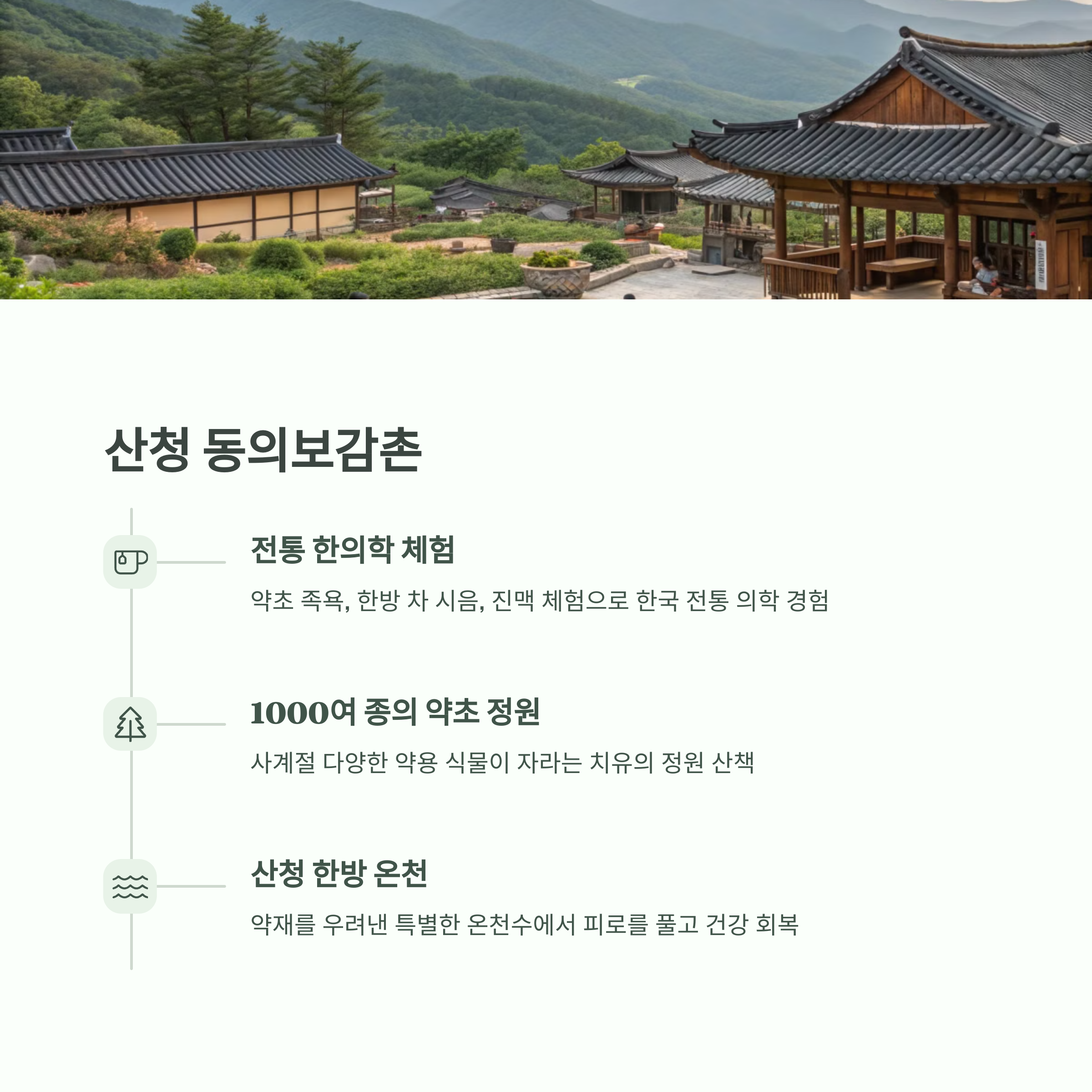 산청의 동의보감 마을에서는 전통 한의학 체험과 함께 힐링할 수 있습니다. 1000여 종의 약초가 자라는 자연 속에서 몸과 마음을 편안하게 가꿀 수 있습니다.