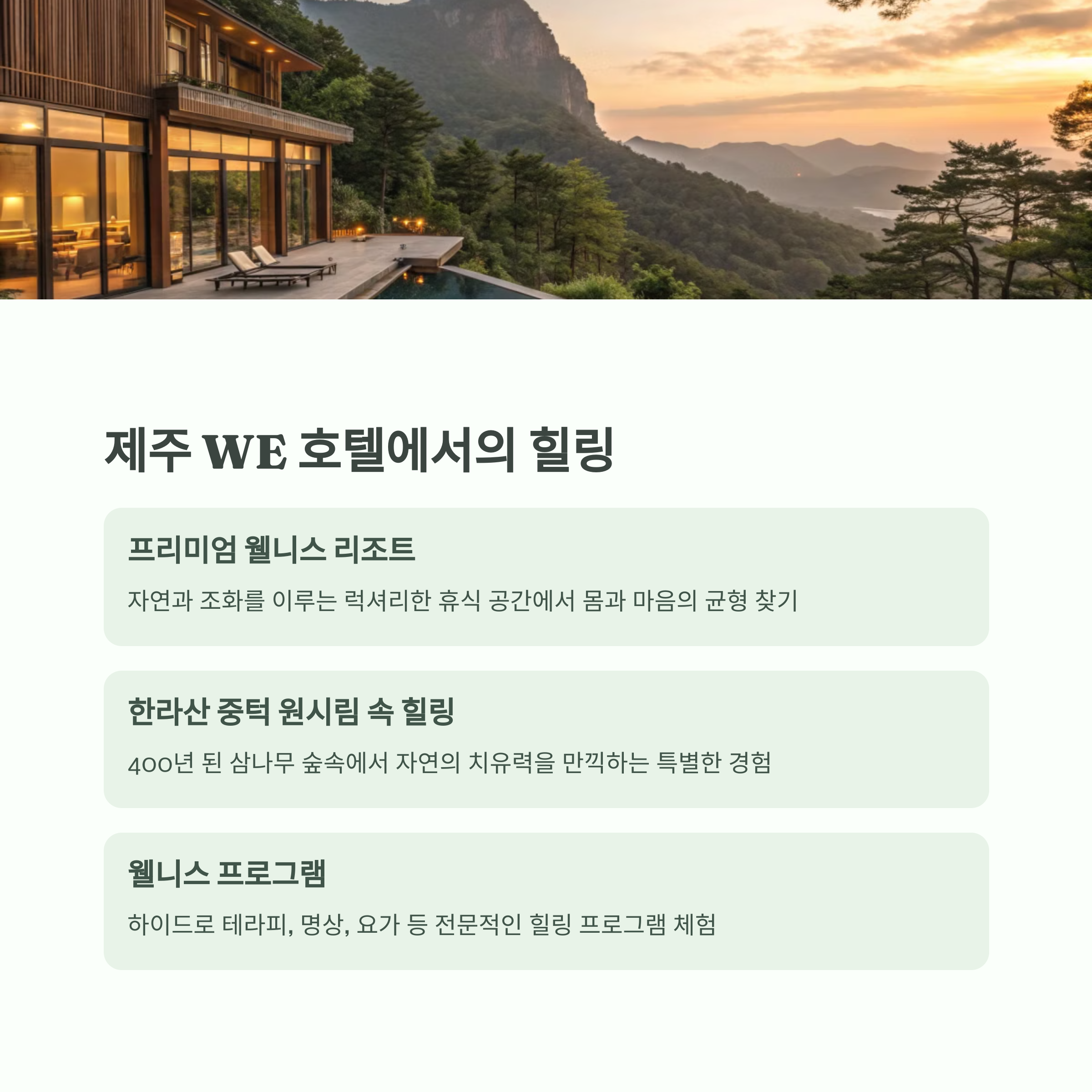 제주도의 WE 호텔은 자연 속에서 힐링을 즐길 수 있는 프리미엄 리조트입니다. 자연과 함께하는 다양한 웰니스 프로그램을 체험할 수 있으며, 스트레스를 해소하고 몸과 마음을 치유하는 데 제격입니다.