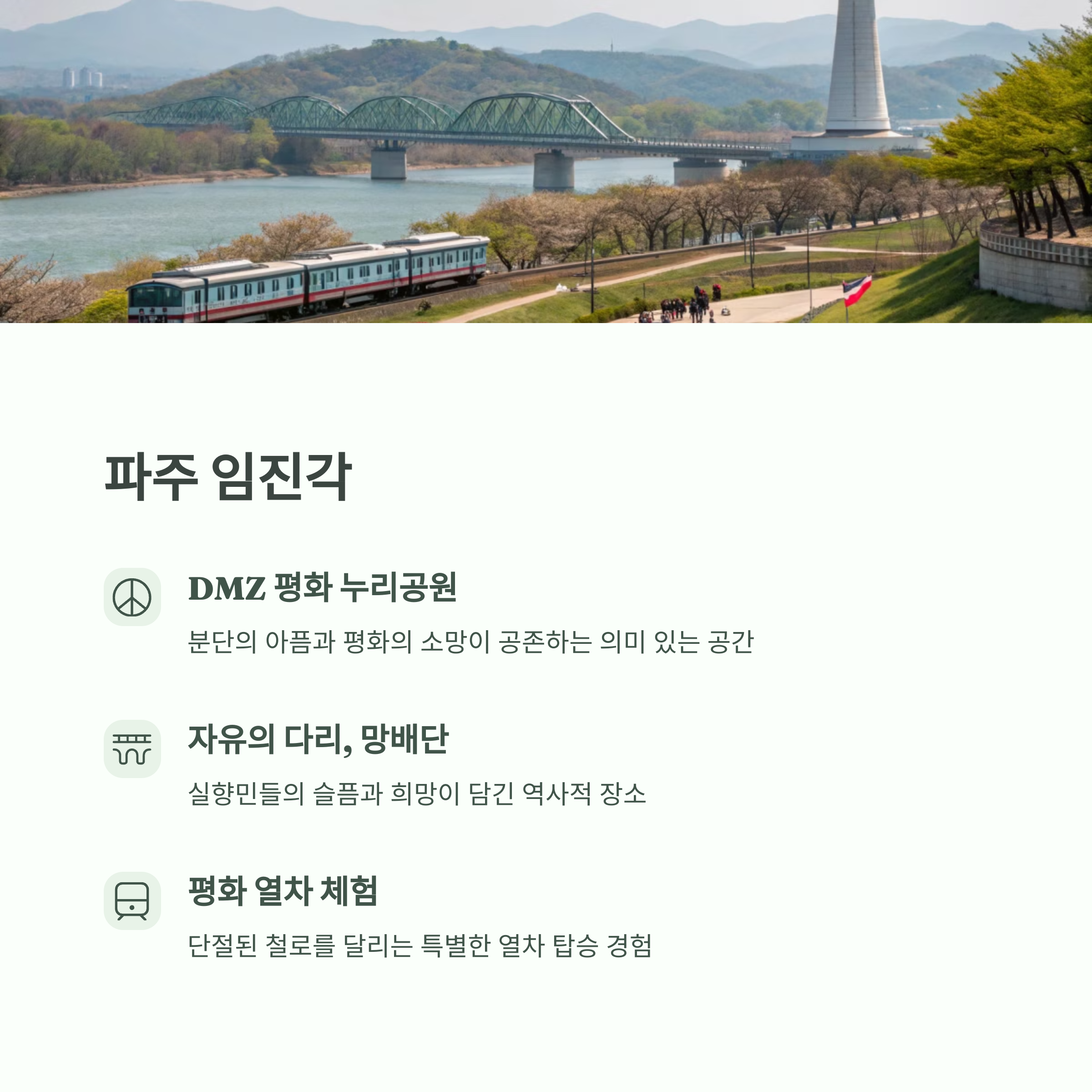 파주에 위치한 임진각은 DMZ와 관련된 역사적 장소로, 평화와 자연을 함께 느낄 수 있습니다. 탁 트인 들판과 예술 작품이 어우러져 있어 감성 여행지로도 인기가 높습니다.