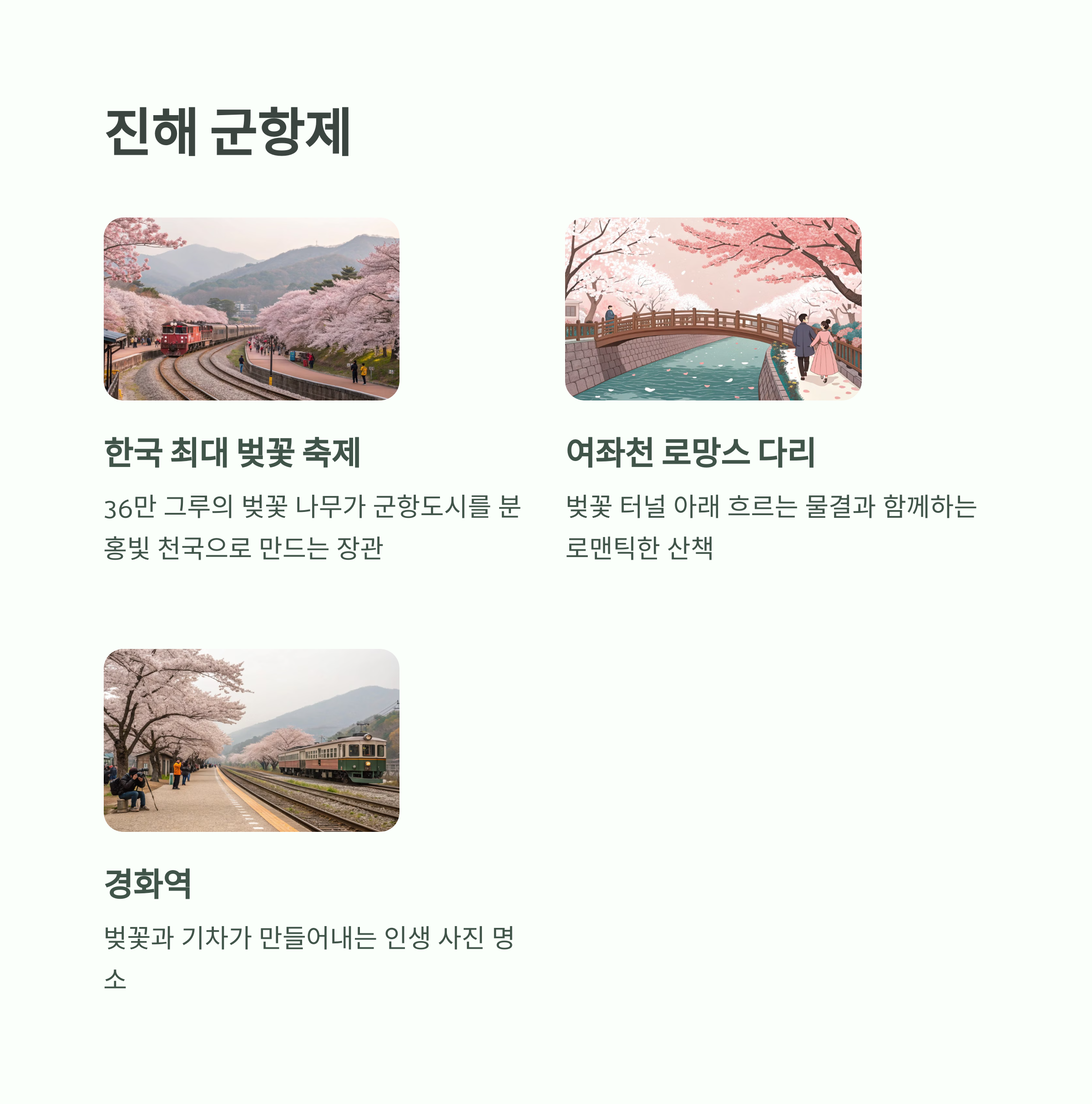 특히 경화역의 벚꽃 터널과 여좌천 로망스 다리가 대표적인 포토존으로 손꼽힙니다.📸